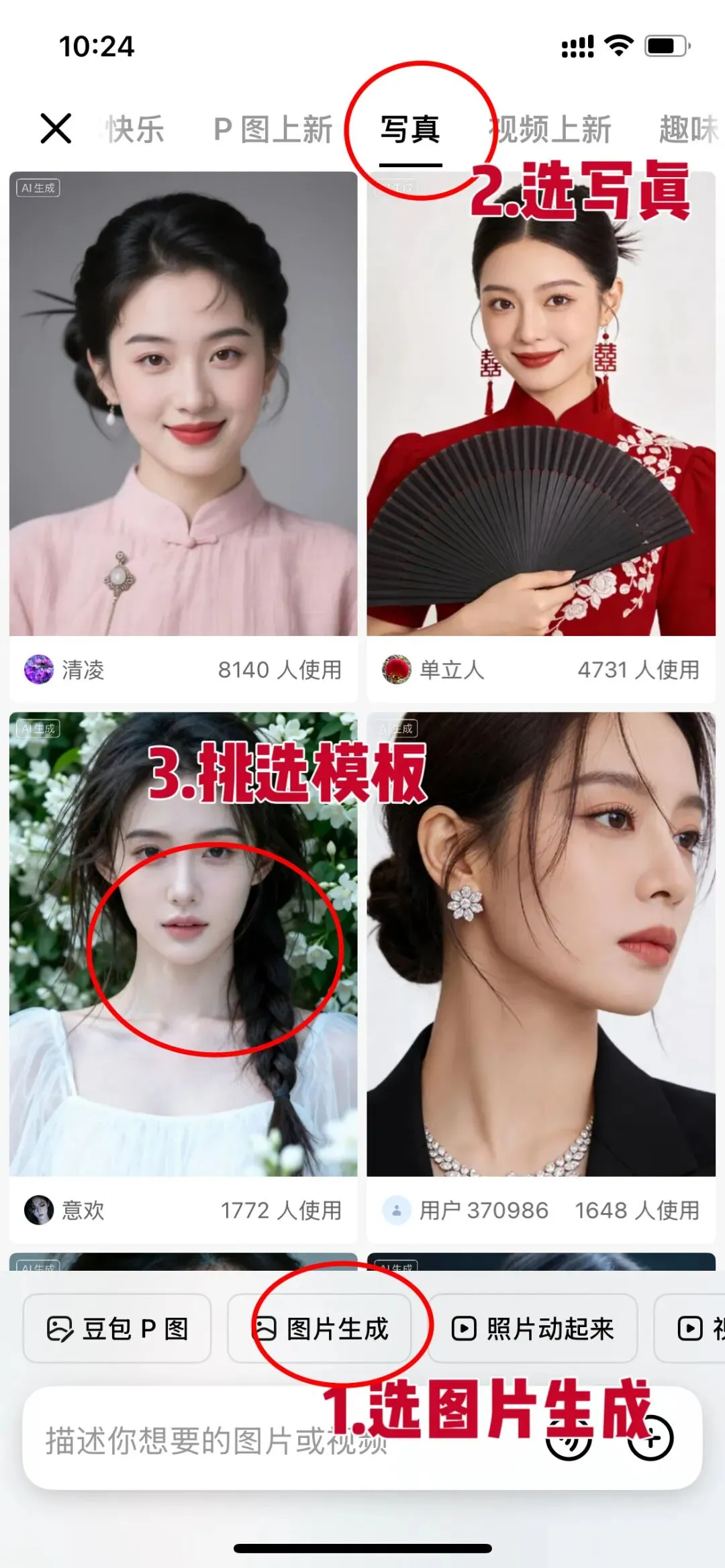 豆包在应用市场下载好在手机后,打开选择最下面的“图片生成”,选择“写真”,系统有非常多的模板,选择自己喜欢的就可以了,点进入。
