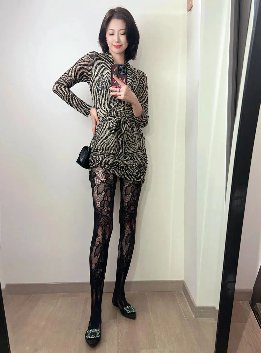 蕾丝黑丝衬出长腿杀!斑马纹连衣裙+清冷御姐脸+锁骨短发+钻饰鞋,谁说轻熟风不能又飒又撩