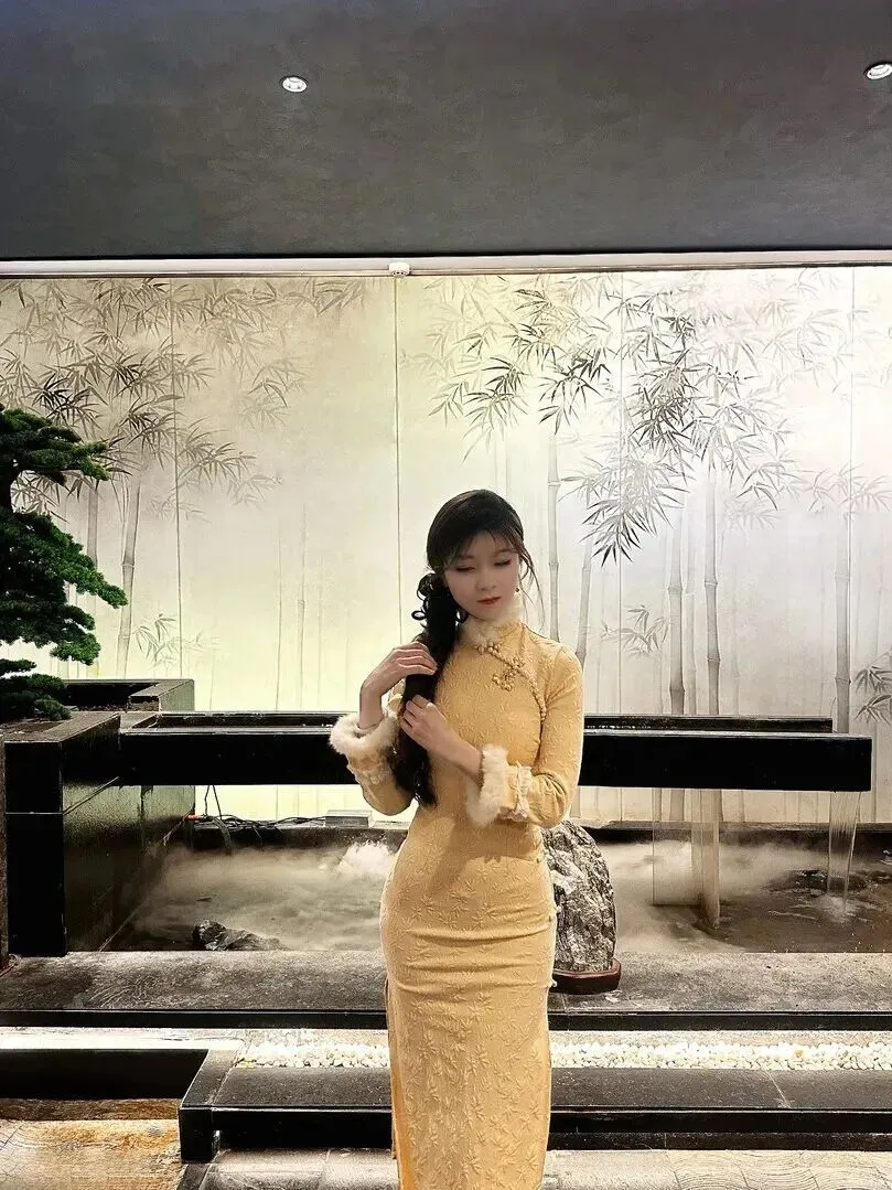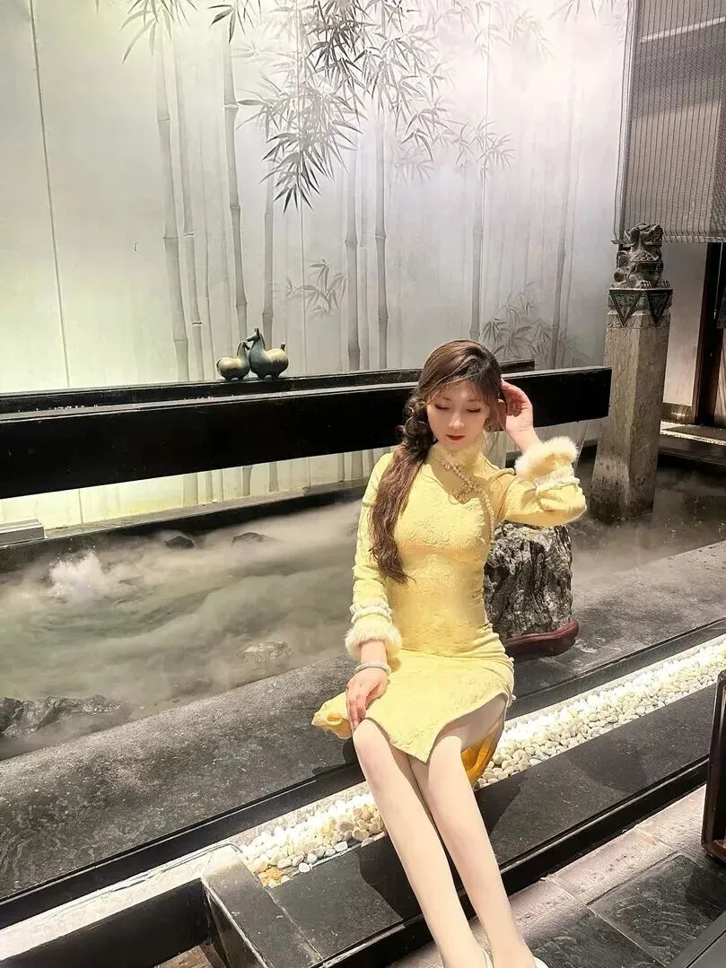 .侧面角.度更绝。.这件.鹅黄色的旗.袍下摆做成.鱼尾状.,针织.面料纹.理细腻.,冬天穿.又暖.又美.。尖.头高跟鞋.上的金属.装饰.亮闪闪.的,开叉.里衬是亮.黄色.,走起路来.肯定很灵动.。女孩.斜坐着.,手轻轻搭.在膝.上,大.小姐.的娇贵.感自然流露.