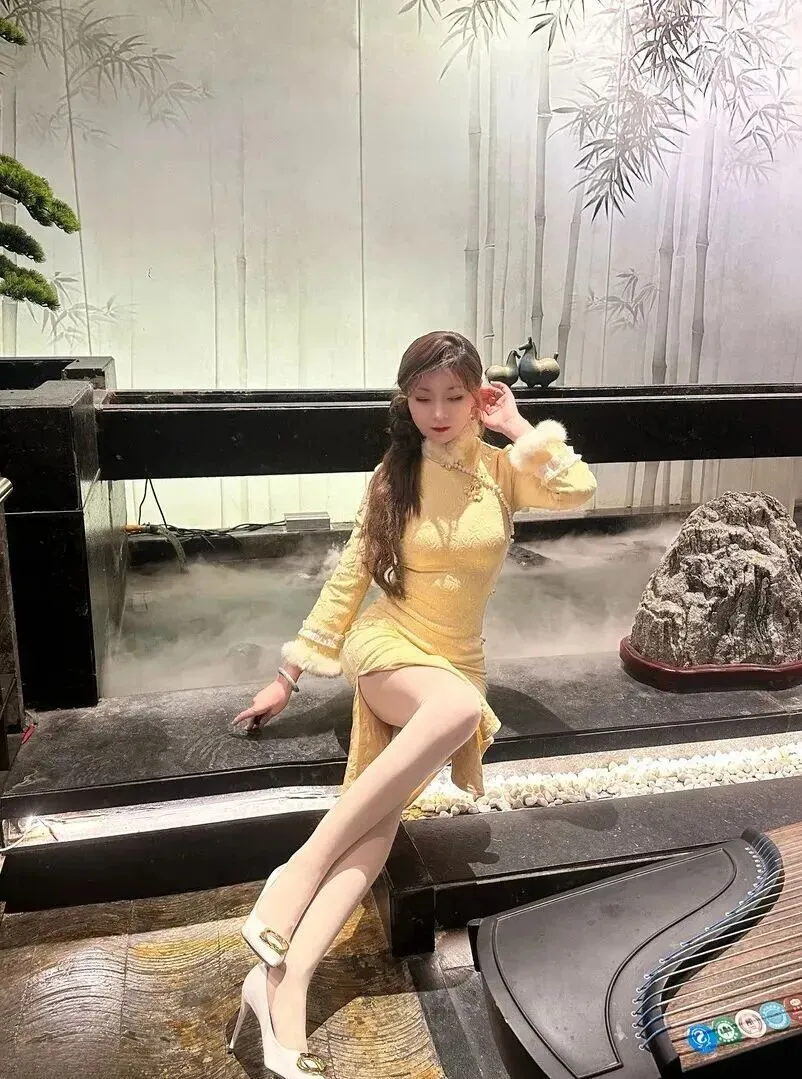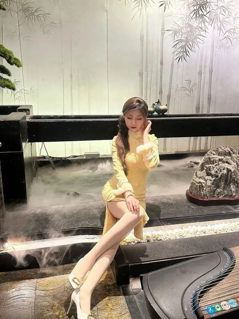 .有氛.围的.要数这张。.女孩坐在.古筝.前,.穿的就.是那.件明黄.色旗袍,.盘扣上镶.着珍珠.和金.属饰物。毛.绒领子.蓬松.柔软,她抬.手整理.头发.的动作.温柔极了.,好像.下一.秒就.要弹一.曲《梅花三.弄》.。这种古.典乐器配.旗袍的搭.配,瞬.间把人.带回民国时.期。