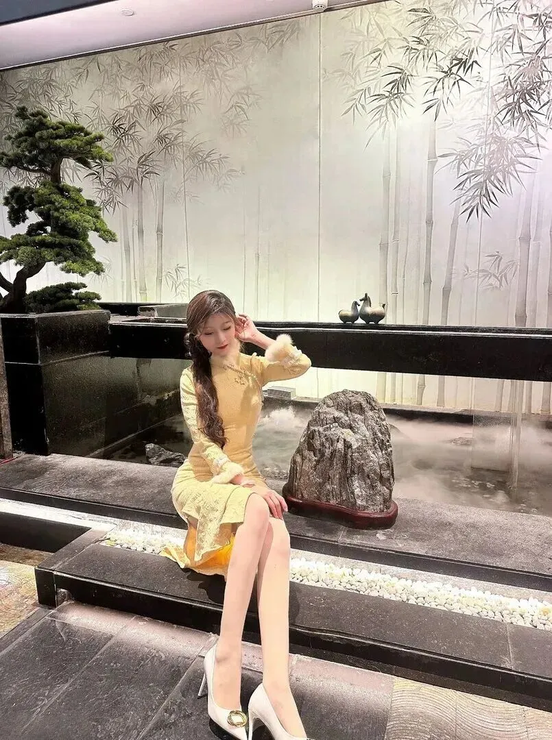 另一.张图里,.女孩坐在黑.色的.台子上,双.腿交.叠着,.姿势.特别优雅。.淡黄色.的旗.袍配了白色.高跟鞋和米.白丝.袜,.显得.腿又细又长.。旗袍下摆.开叉.的地.方若隐若现.,脚上.的鞋扣闪着.金光.,整体看起.来高级.又不夸张。