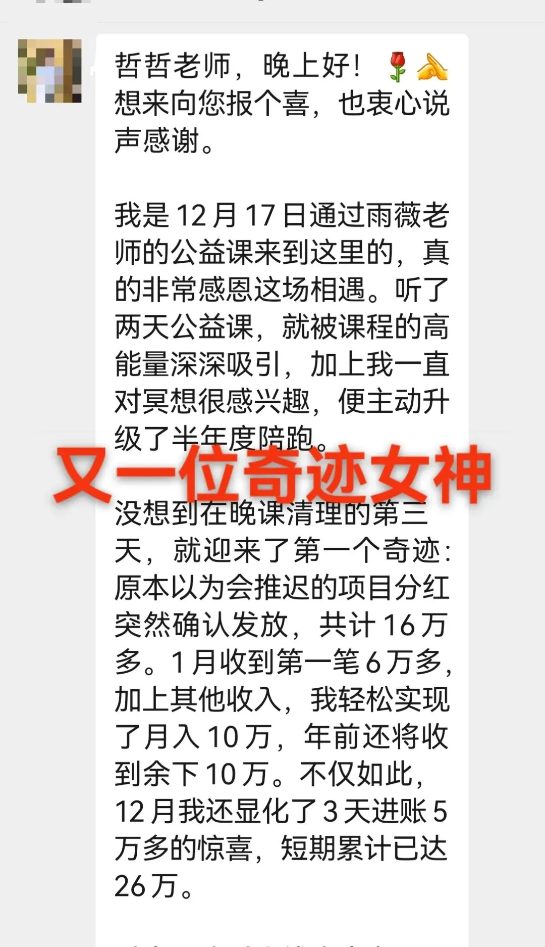 没想到在晚课清理的第三天,就迎来了第一个奇迹:原本以为会推迟的项目分红突然确认发放,共计16万多。1月收到第一笔6万多,加上其他收入,我轻松实现了月入10万,年前还将收到余下10万。不仅如此,12月我还显化了3天进账5万多的惊喜,短期累计已达26万。