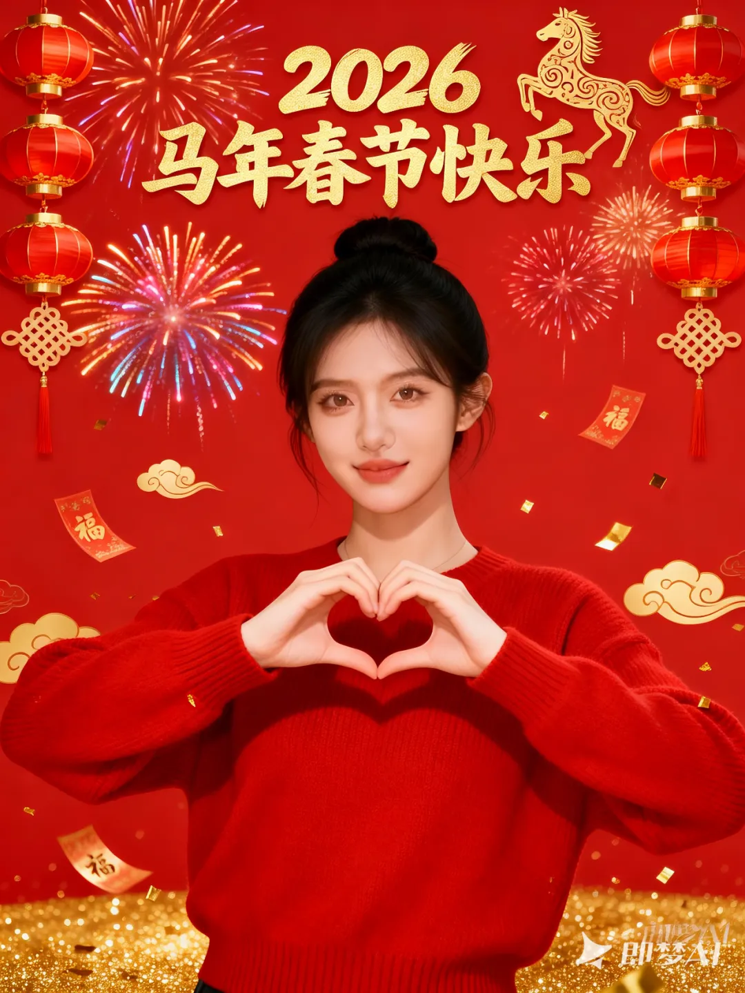 中国美女,皮肤白皙,多半身入镜,脸部、手部、发丝细节拉满;发型为干净利落的盘发,凸显精致气质;身着红色时尚休闲毛衣,契合马年新春氛围与时尚感;妆容精致自然,五官立体凸显,樱桃小口,面色红润尽显好气色;背景以正红色为基底,上方有金色艺术字“2026马年春节快乐”,搭配精致鎏金马纹图案,两侧错落布置中式红金灯笼串与镂空中国结,空中绽放绚烂渐变烟花,点缀金色祥云纹、福字飘饰与金箔碎,地面轻铺金粉,全方位营造浓厚饱满的马年新春喜庆氛围;人物面向观众,双手比爱心,动作活泼灵动,每张呈现不同的可爱神态,凸显娇俏活泼气质;拍摄为真实摄影风格,中景多半身拍摄,正向视角,8K高清超细节,专业光影打光,突出面部、手部质感与衣物纹理,营造高级电影质感;滤镜以高饱和红金为主色调,金色元素做金属光泽提亮,提升画面明亮度与层次感,强化新春喜庆氛围,打造大师级新春摄影作品质感美丽的中国美女,皮肤白皙透亮,多半身入镜,脸部、手部、发丝细节拉满;发型为蓬松大波浪卷发,发丝柔顺有光泽,慵懒又优雅,发尾微卷灵动,凸显精致氛围感;身着红色软糯时尚休闲毛衣,质地柔软亲肤,领口简约大气,细节处彰显品质,贴合马年新春氛围,兼具时尚感与新春活力;妆容为精致自然款,清透底妆完美凸显白皙肌肤,五官精致立体,樱桃小口涂抹淡淡的红色口红,眉眼温柔,增添甜美温婉气质;背景以正红色为基底,搭配鎏金祥云纹、立体马年剪纸与浮雕马图案,上方是金色艺术字体“2026马年春节快乐”,字体周围点缀细碎金箔、光效与银粉,两侧悬挂错落有致的红金灯笼串、刺绣中国结与流苏挂件,空中绽放着绚烂多彩的烟花,地面铺有淡淡的金粉光晕,角落点缀盛开的红梅与金竹,还有飘动的福字飘带,全方位营造浓郁饱满、高级精致的马年新春喜庆氛围;美女面向观众,手持红色手工编织、缀有金色福字与流苏的中国结,置于胸前,脸上带着浅浅的温柔微笑,眉眼弯弯,姿态优雅舒展,自然大方,尽显温婉甜美的气质;拍摄采用真实摄影风格,中景聚焦人物多半身,正向视角,2K高清画质,利用专业柔光打光,突出人物脸部、手部纹理与发丝质感,模拟自然柔和光线效果,营造细腻高级的电影质感;滤镜以红金为主色调,金色元素凸显金属光泽,适当提高色彩饱和度与对比度,保留人物肌肤与衣物的自然真实质感,画面明亮通透、层次感丰富,强化新春喜庆氛围,呈现大师级作品的高级质感另外,请关注:白术AI,然后加ytx5213039,可领取《AI自媒体起号》精华文字版一份!以及破局行动家AI大会嘉宾分享合集文档,价值极大!全网独一份!