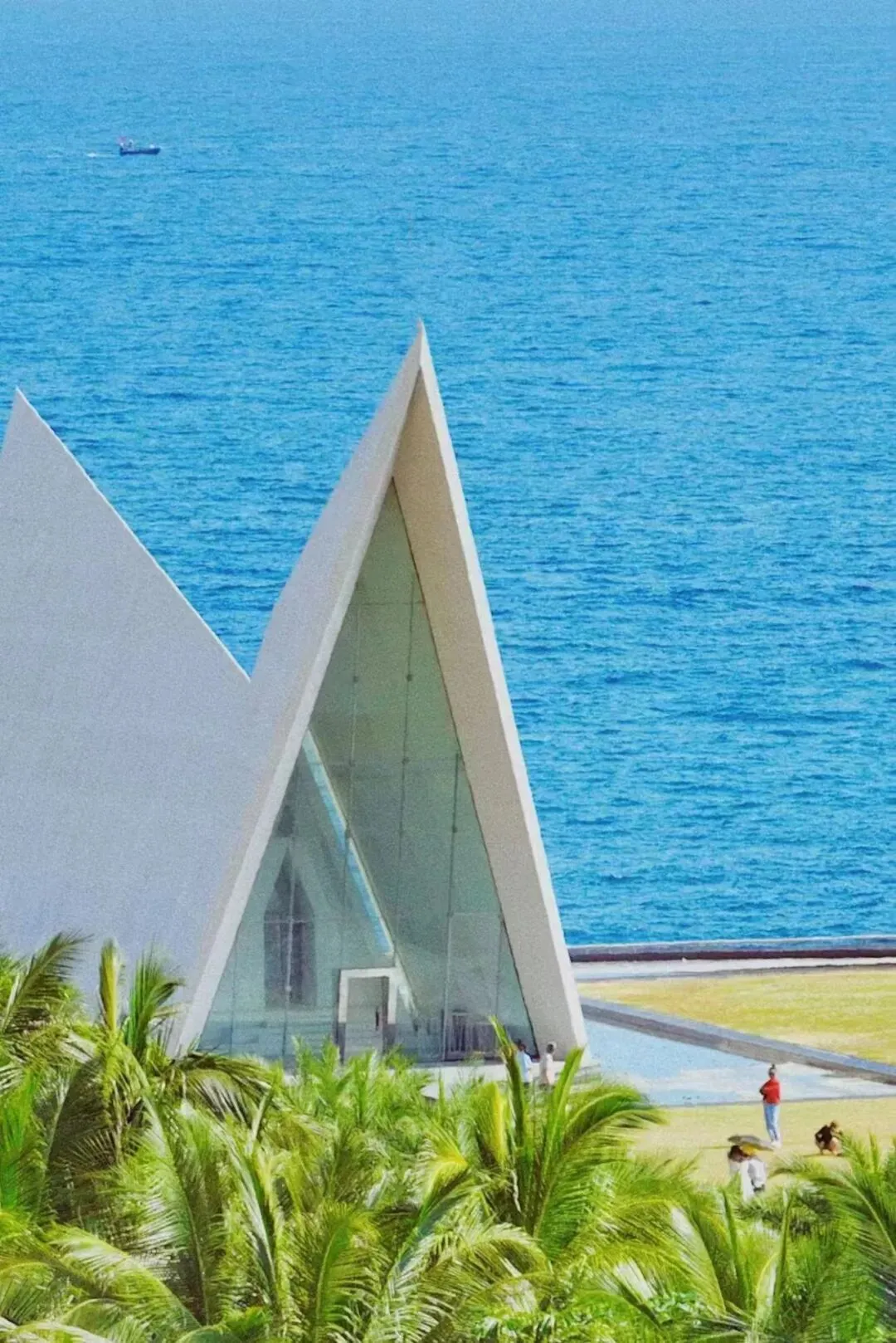 纯白三角建筑,面朝湛蓝大海,是拍日落写真、情侣合影的出片胜地。