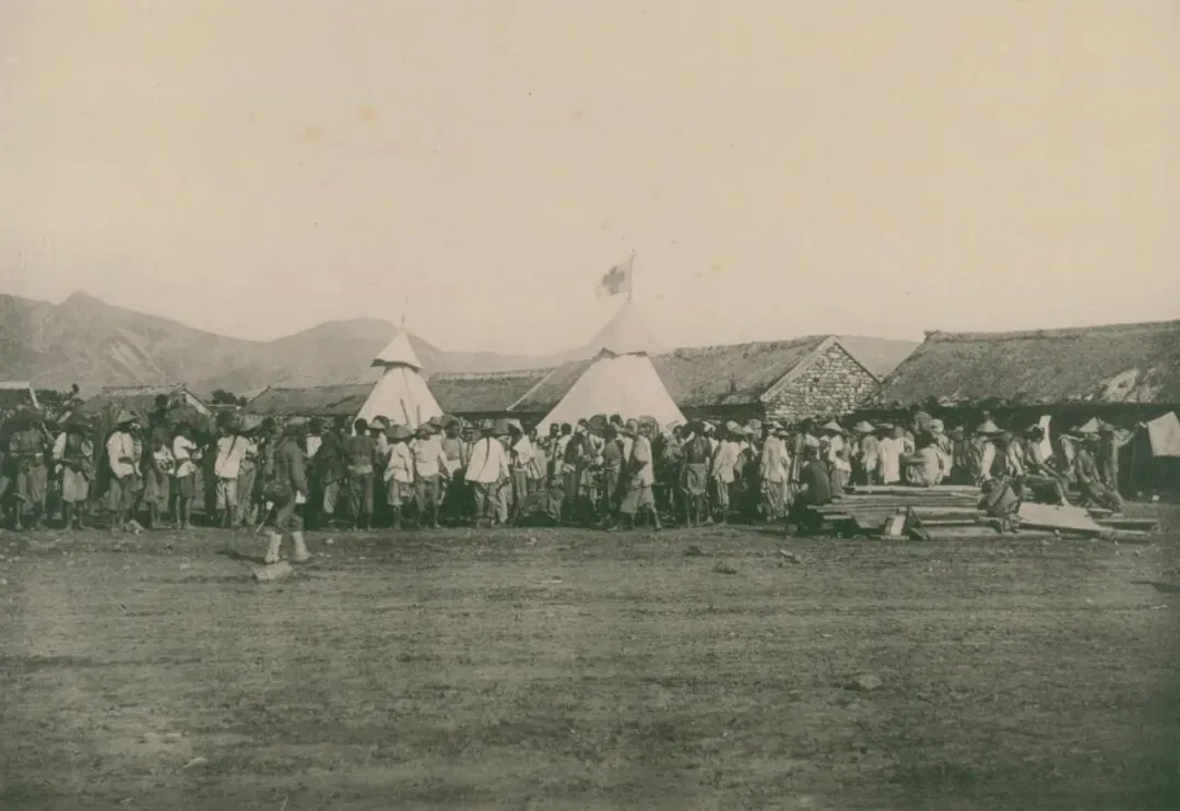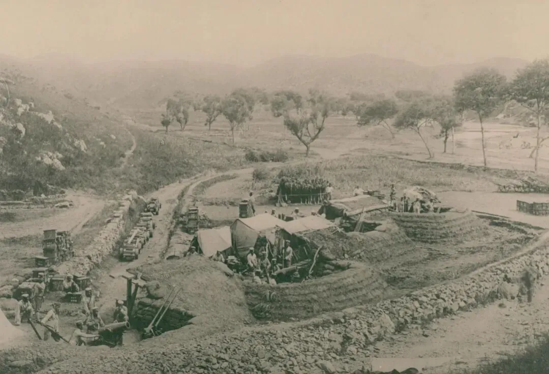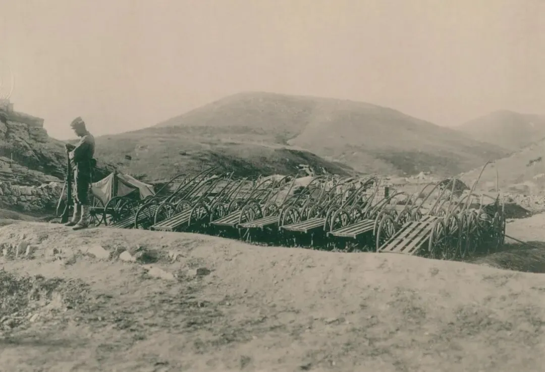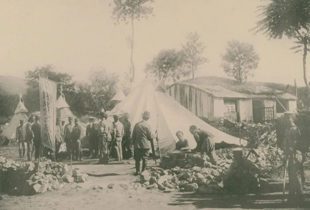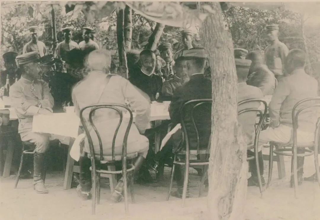 日俄战争结束后的1905年3月22日印刷,同年3月25日在日本东京发行,意在炫耀其对沙俄战争胜利而发行的【日露战争写真帖】。日军第三军第一师团长松村务本及其参谋部成员,于1904年9月 24日,在高崎山(164高地)半坡营地前合影。164高地位于碾盘沟西南大约1100米处,日俄双方经过激战,被日军步兵十五联队攻占,便以该联队总部所在地高崎市命名,164高地又称“高崎山”。从凤凰山东南方的一座山上,望向第一师团战斗的情景,1904年9月19日下午4点20分。1904年8月23日下午6点,日军炮击旅顺东北部的俄军阵地。1904年8月23日午后5点,俄军炮弹在团山子附近爆炸,团山子山在龙头姜家村附近。1904年8月28日下午4点,日军步兵炮兵第三联队第五中队,在王家甸(龙头街道王家村)对旅顺东北部的俄军前沿堡垒发起进攻。1904年9月7日,天皇御使宫本侍从武官和尾头东宫武官视察慰问东龙头医院。1904年9月10日,大孤山东北麓,日军第十一师团司令部营地。1904年9月10日,大孤山下日军的炮兵马匹马厩,野战炮兵第十一联队第二中队营地。1904年9月10日下午两点,在大孤山东北方低洼地带的战斗准备,日军步兵炮兵第三联队第八中队,口径15厘米的臼炮四门。鞠家屯东北方约千米的低洼地带,步兵炮兵第二联队的阵地。1904年9月14日上午10点10分,火炮为15厘米臼炮,由破布和垫子制成的遮盖物是炮手的休息棚。1904年9月14日下午,日军针对东鸡冠山堡垒进行堑壕作业。1904年9月14日下午,大孤山北麓日军野战炮兵第十一联队的马匹、马厩,以及该联队的营地。1904年9月14日,鞠家屯东南方约一千米的一处凹地,鞠家屯在大孤山西北方向。日军将28厘米口径榴弹炮运往于大山东麓的攻城炮阵地,墓碑处是战死的日本人坟墓。日军将28厘米口径榴弹炮运往于大山东麓的攻城炮阵地1904年7月26日下午,韩家屯日军野战病院手术室。1904年8月10日下午5点,中国民工正将日军伤员送往长岭子火车站附近的一座野战医院。日军在邱家屯西南方谷地收集缴获的炮弹,这些炮弹是第九师团在攻占盤龙山堡垒时缴获的。1904年9月28日,各师团长及外国武官,在第三军司令部屋后搭建的帐篷中参加宴会。日俄战争给中国人民带来了直接的生命和财产损失,严重践踏了中国主权,使清政府在国际上颜面扫地一蹶不振,为日本后续侵华埋下伏笔。这段屈辱历史,也是中华民族集体记忆中抹不去的伤痛。链接: