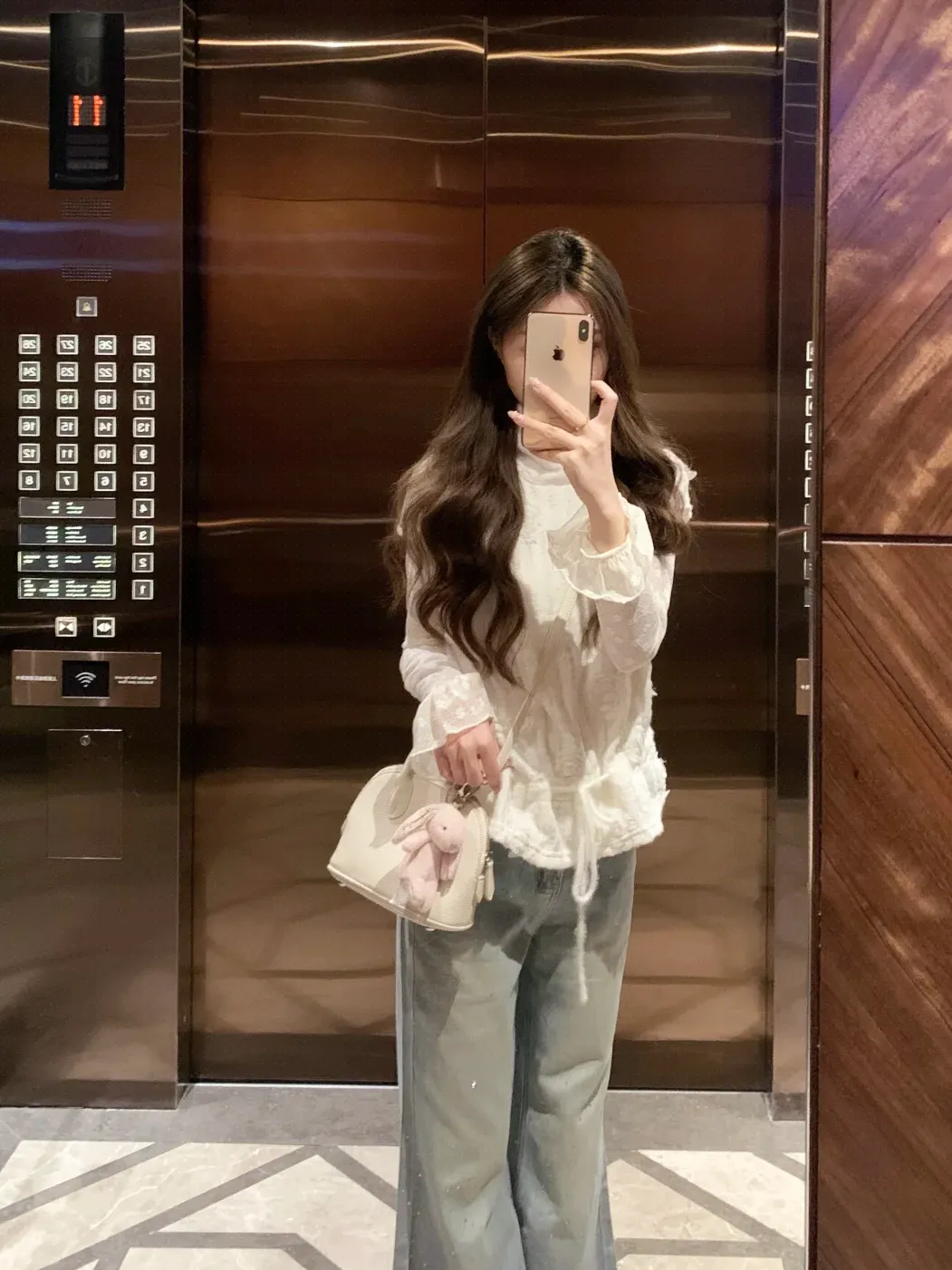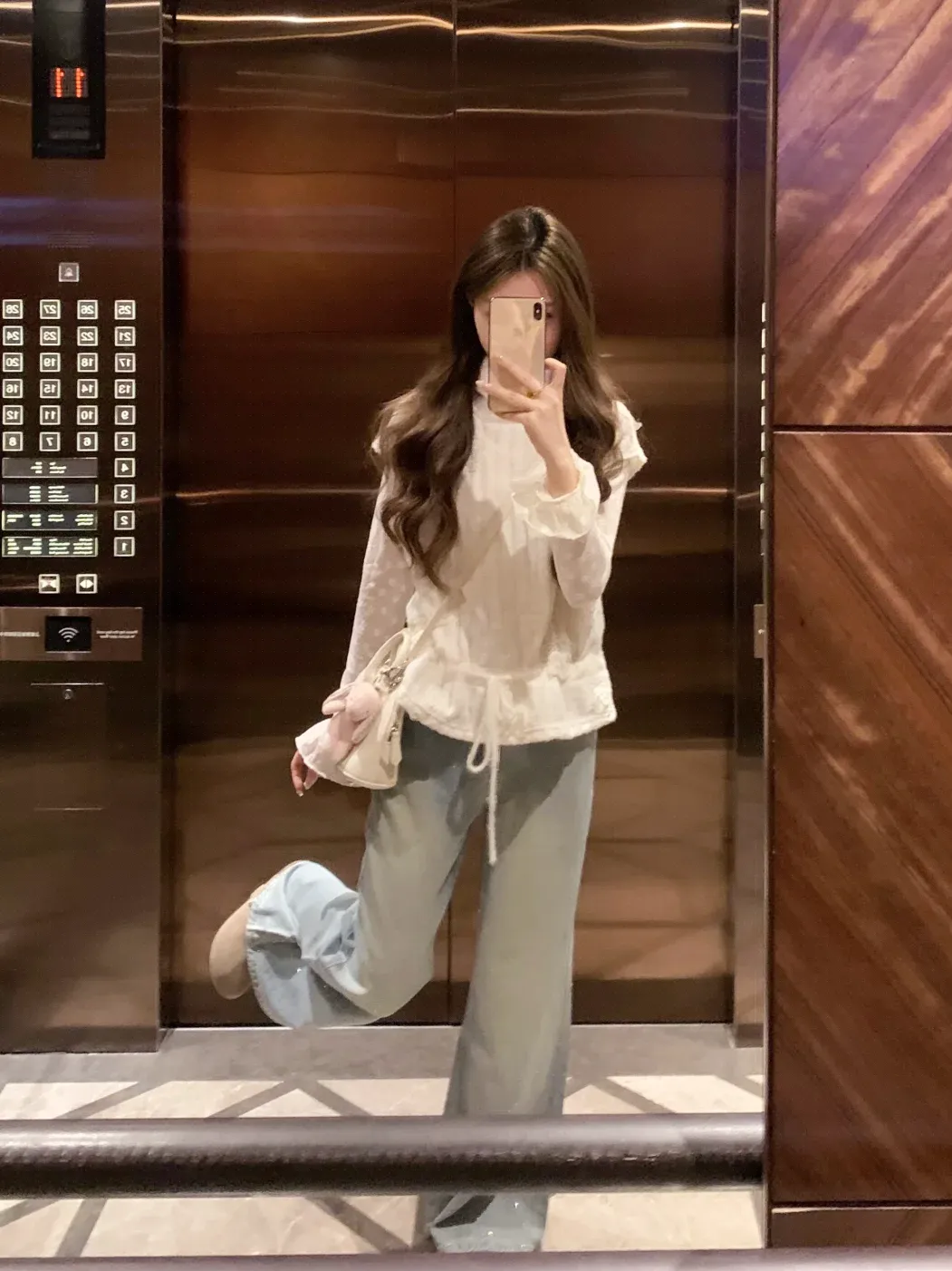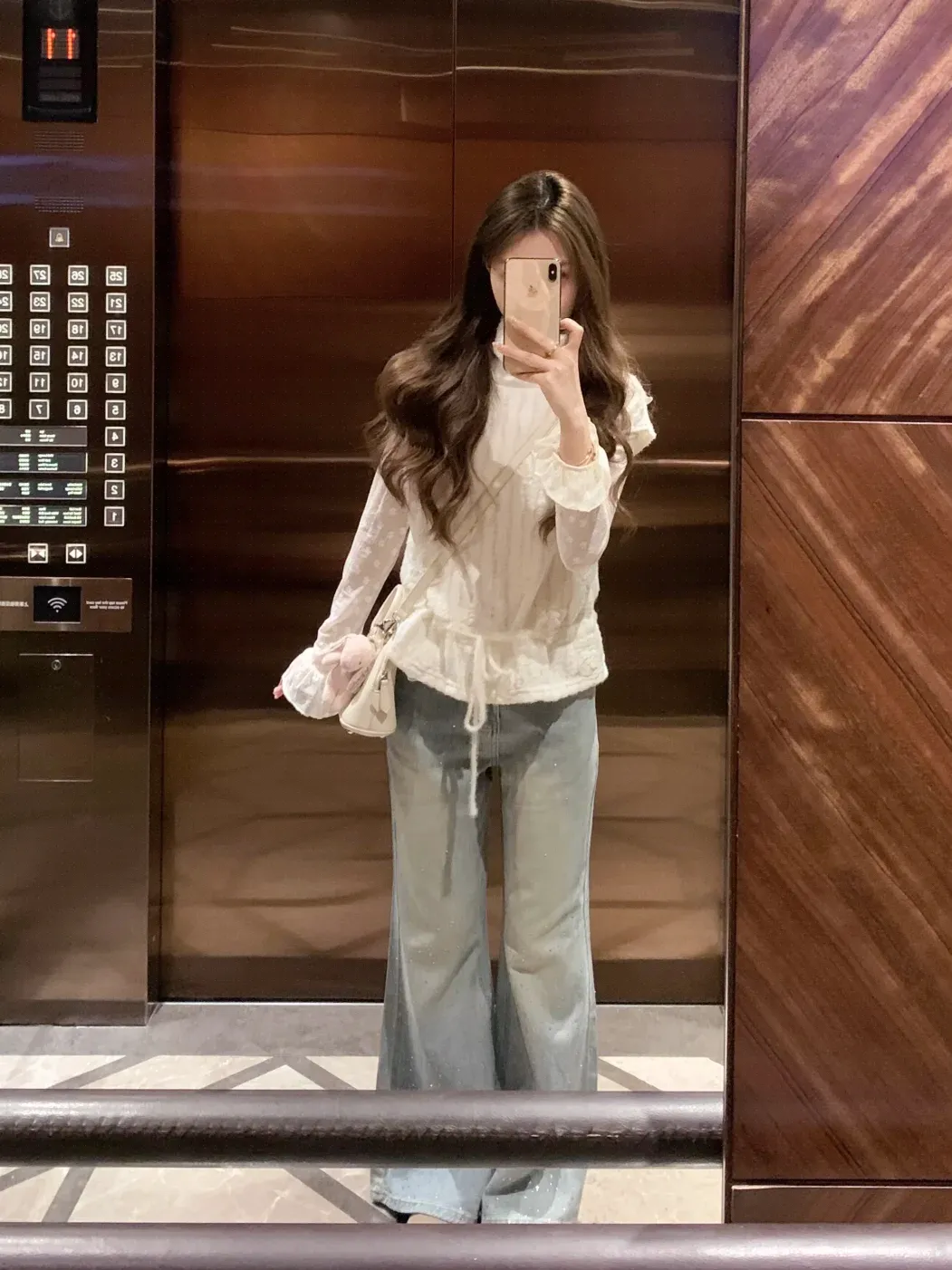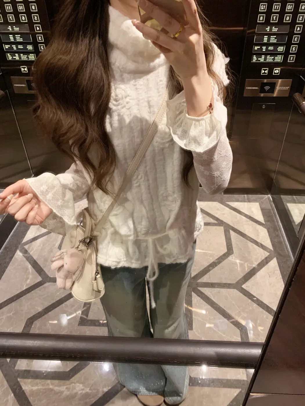 奶白蕾丝上衣自带温柔氛围感,荷叶袖与抽绳设计灵动精致,搭配浅蓝闪钻阔腿裤,慵懒显高又仙气,日常出街温柔又出片。