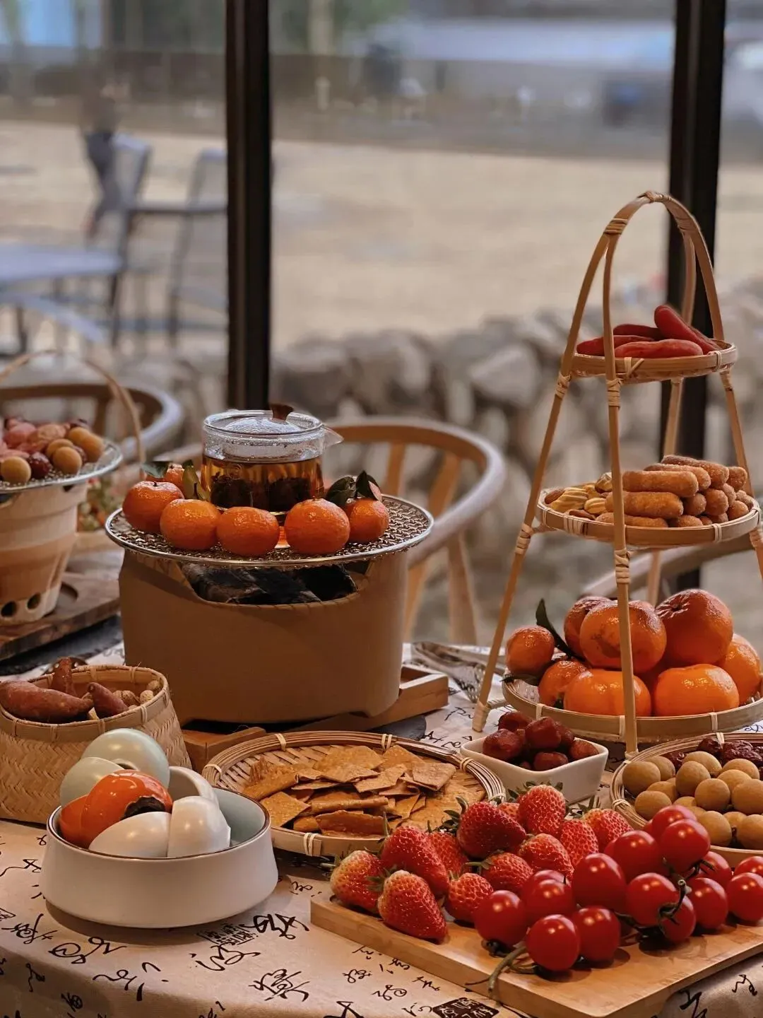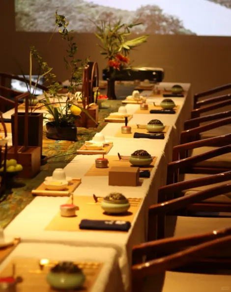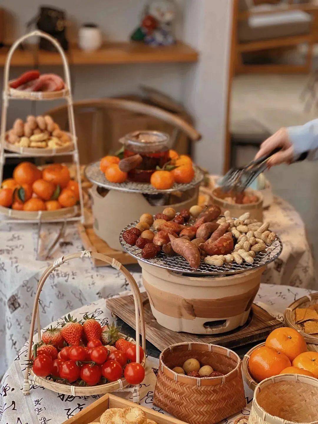 在书院庭院或露台,与三五知己围炉而坐。看铁壶中泉水沸腾,投入老茶,慢慢煮出醇厚香气。周围烘烤着红薯、年糕、橘子,茶香与食物香气氤氲交融,正是畅叙闲聊、拍照打卡的最美背景。