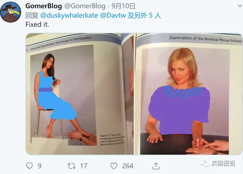 Kate更是直接艾特了剑桥大学出版社:“能麻烦你们解释一下,为什么你们觉得在骨科教材中有必要出现软色情图像呢?”
