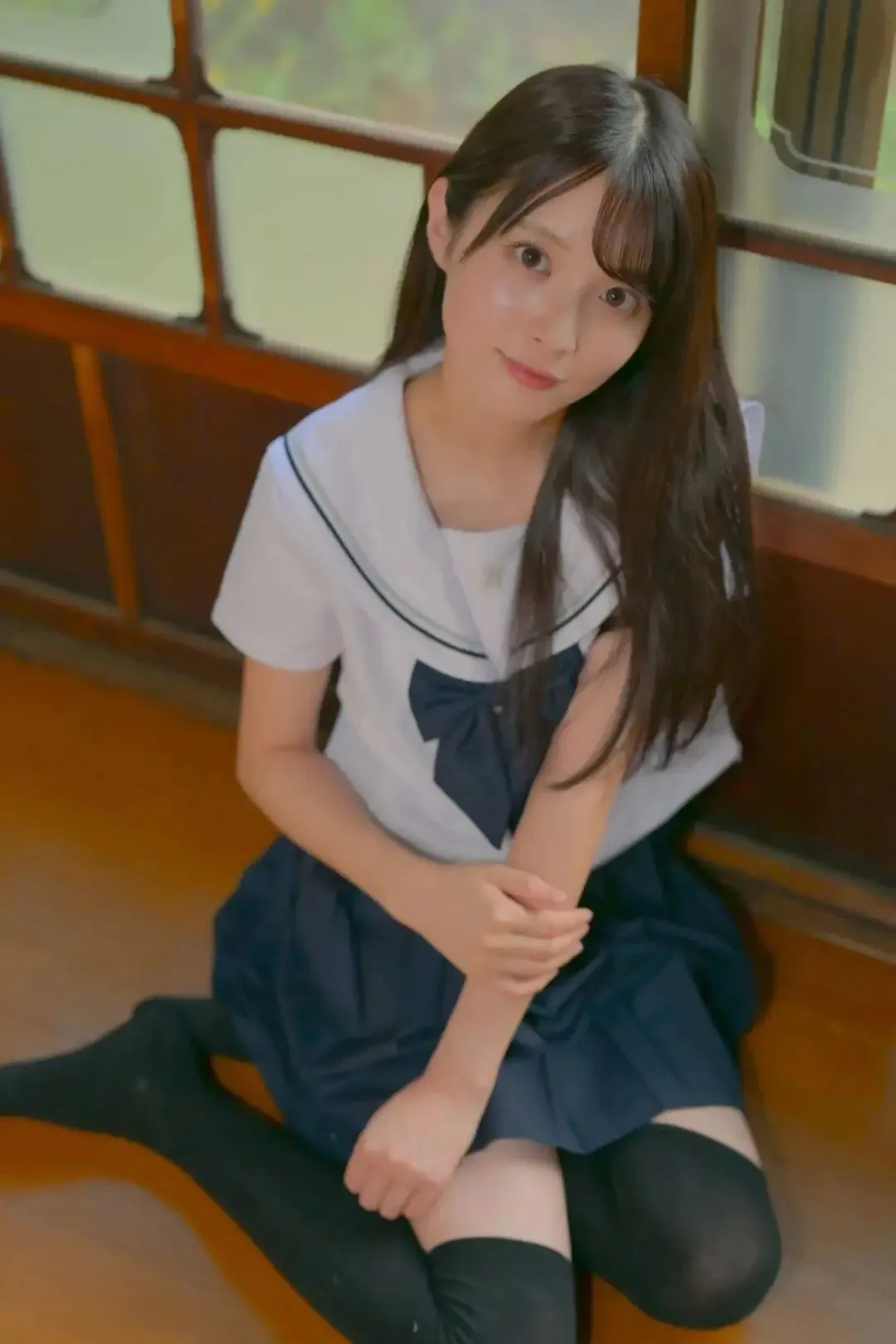 JK制服在她身上简直太有味道了。经典的藏青色西装外套搭配格纹百褶裙,领口的蝴蝶结系得一丝不苟,就连裙摆的长度都完美复刻了日本女高中生的标准穿搭。最绝的是她坐在讲台上的样子,双腿微微并拢,手里还拿着课本,活脱脱就是从动漫里走出来的优等生形象。