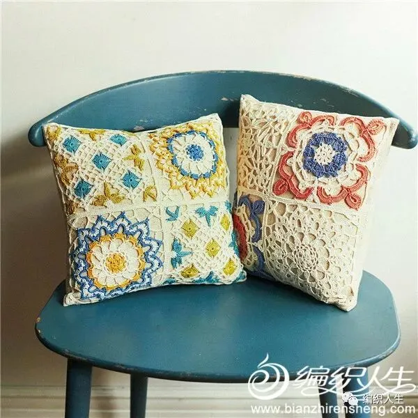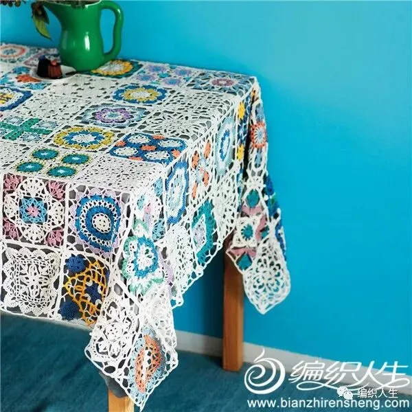 来自外网的这款居家钩针蕾丝作品由多枚白与彩色的蕾丝花片混合拼搭