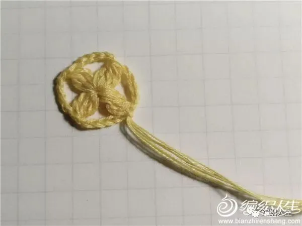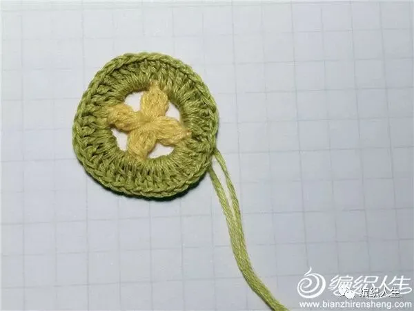 【织片四角的“十字花”钩法】绕线4圈,先钩2长长针并1针,在此基础上再钩2长长针并1针,