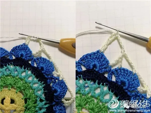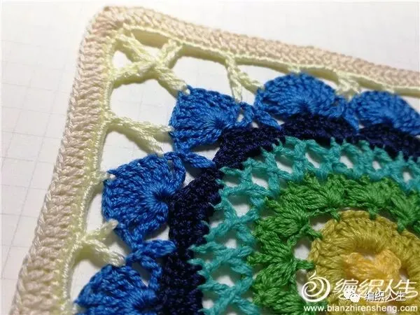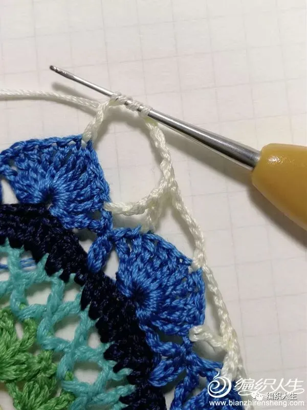 10、加的一圈长针钩法是:每针短针上钩1长针,四个角的锁针空间内钩“2长针1锁针2长针”