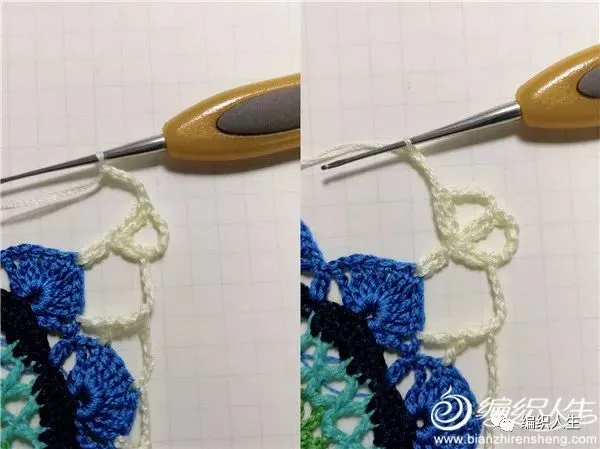 5锁针,然后从已完成的2组长长针并针的中间部分挑线钩2长长针并1针,5锁针,再次从中间部分钩2长长针并1针