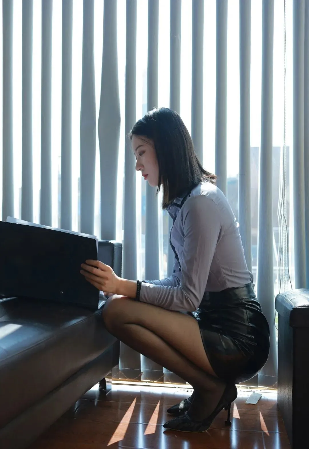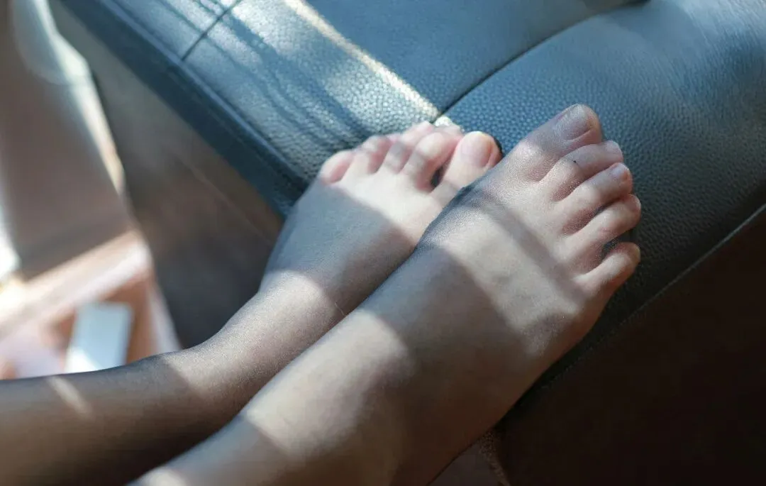 阳光穿过百叶窗,在袜面上投下竖条纹的光影,像流动的暗纹,每一次抬腿都带着柔焦的美感。脚踝处的袜边隐在鞋口,若有若无地勾着视线;小腿肚的肌肉在丝袜的包裹下显得柔和,没有紧绷的突兀,只有松弛的曲线,就连膝盖处的细微褶皱,都被这层朦胧衬得格外温柔。