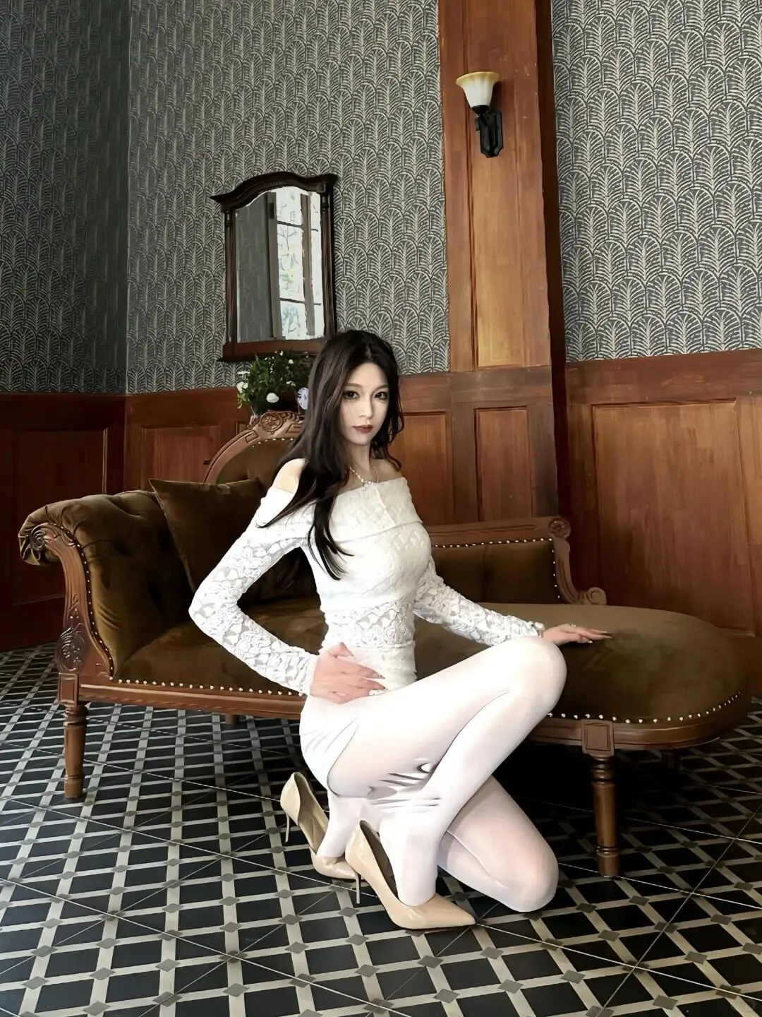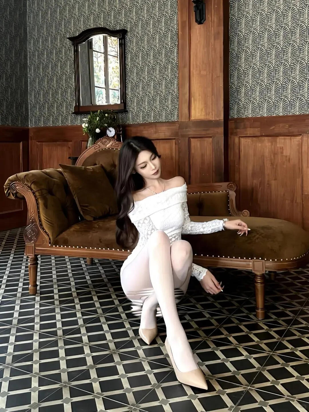 当前位置:首页>美女资讯>白蕾丝一字肩+白丝+裸色高跟!复古空间的纯欲仙女,氛围感直接拉满