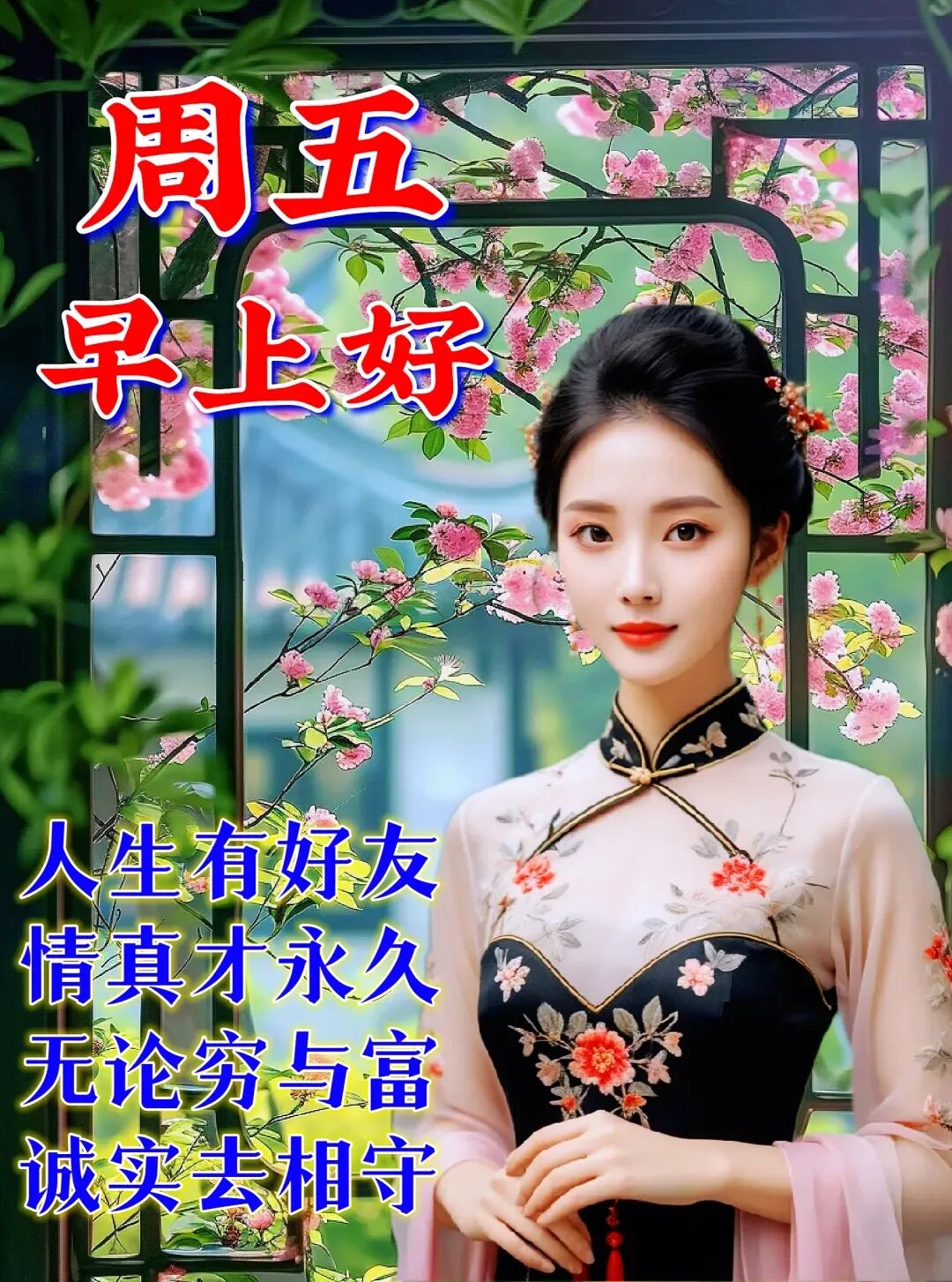 纯朴的友情,百年不变;心中的诚意,一生惦念;每天的问候,平平淡淡;真诚的祝愿,平平安安,周五早上好!生活何须论苦甜,开心才是好流年;友情何须计聚散,牵挂才是暖心弦,晨安问候报平安,愿你康健无忧烦,日日开心岁岁欢!周五早上好!