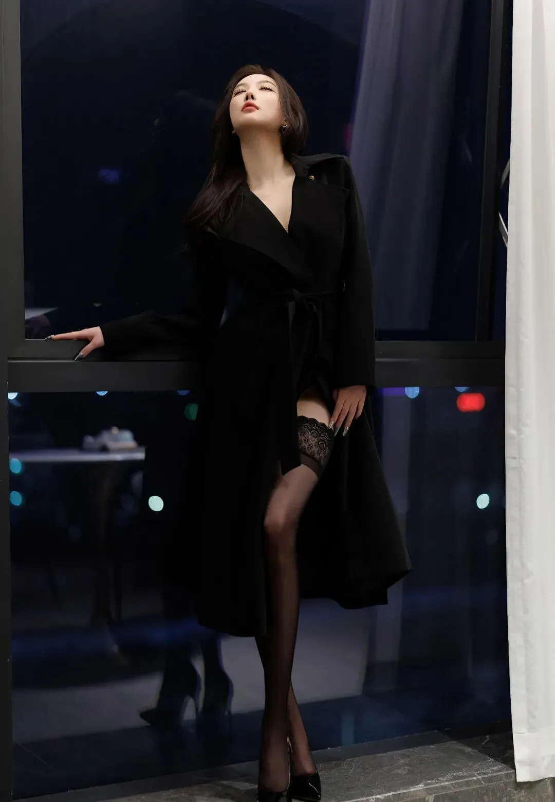 侧身倚靠栏杆,腿微微抬起,露出黑丝蕾丝边,借助夜景的光斑营造朦胧感;动作松弛不僵硬,像刚结束晚宴的随手抓拍。