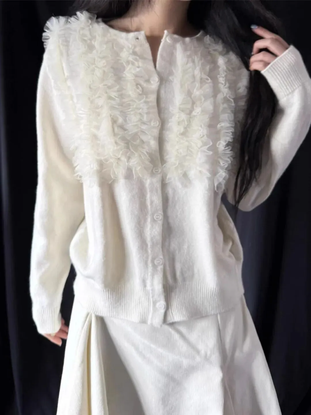 这件开衫以纯净的白色为主色调,给人一种清新、柔和的感觉,就像春日里的白云,轻盈又美好。最吸引眼球的当属胸前的蕾丝花边设计,层层叠叠的蕾丝,如梦幻般轻柔,将女性的温婉与优雅展现得淋漓尽致。每一处蕾丝的纹理都精致无比,彰显着高品质的工艺。