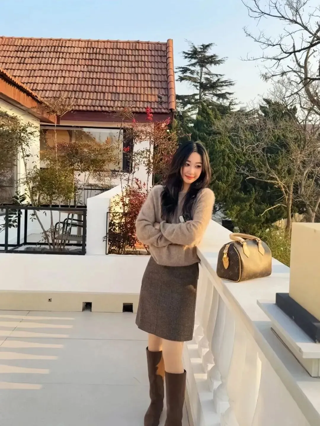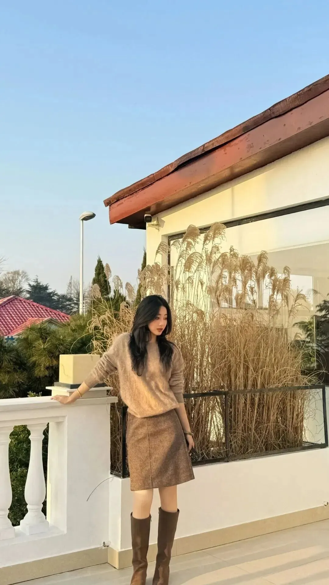 .绒毛衣+短.裙的搭.配特别适合.周末.!浅卡.其色.毛衣搭.配深棕.色短裙.,再穿一.双低.跟中.筒靴,走路.不累脚。和.闺蜜自拍.的时.候,.毛衣.的绒毛.质感会让.照片看起.来更治.愈。