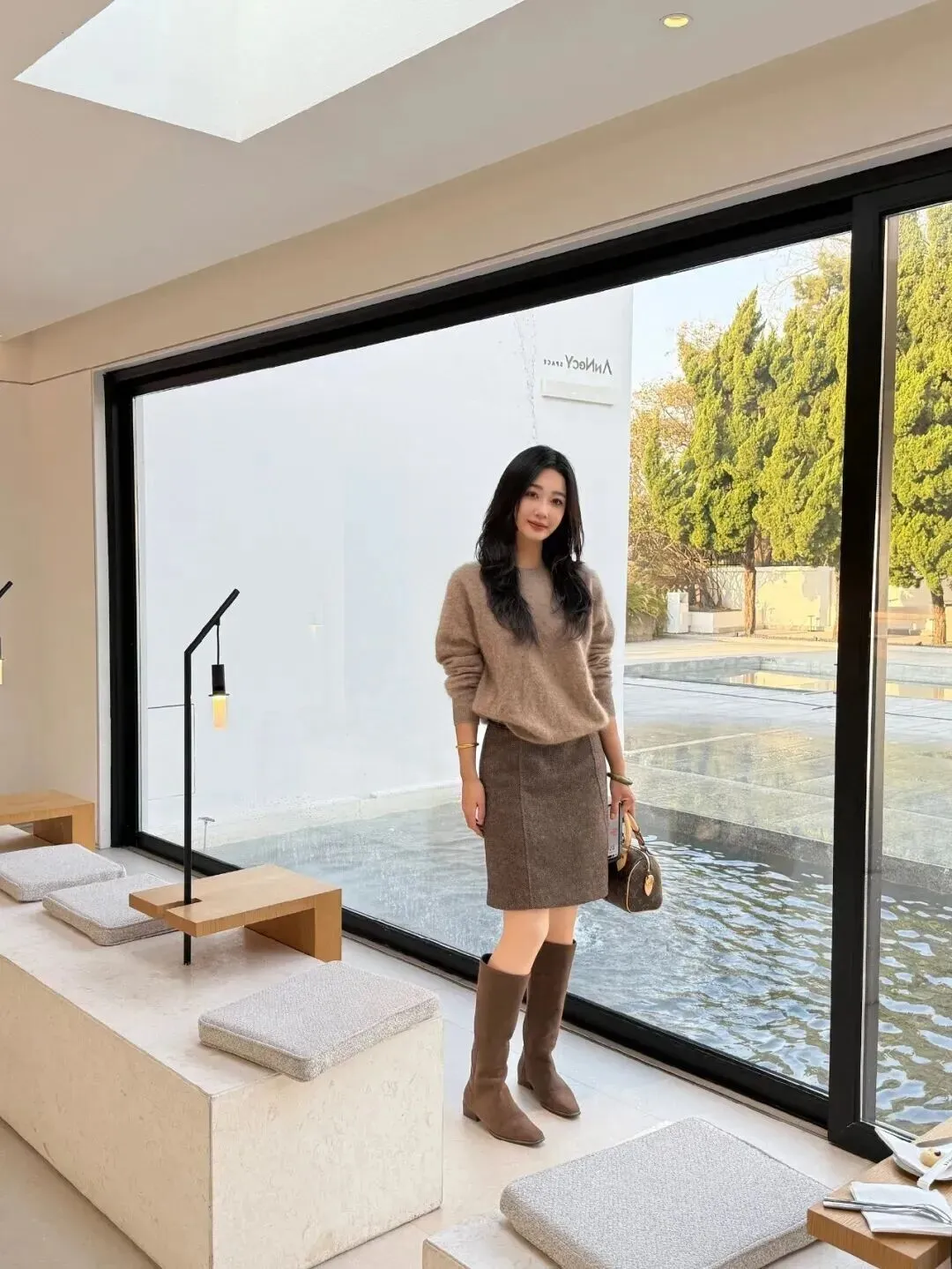 .班族可.以试试这套.!浅卡其毛.衣搭配深.棕色及.膝半裙,中.筒靴选哑.光皮的,不.会太夸张。.整体看起来.干净.利落,开会.见客户.都不掉链子.,下班直.接去约会.也没问题。