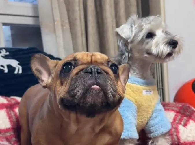 刚好她家老抽法斗最好的朋友是雪纳瑞,所以她就拍了个对比视频。
