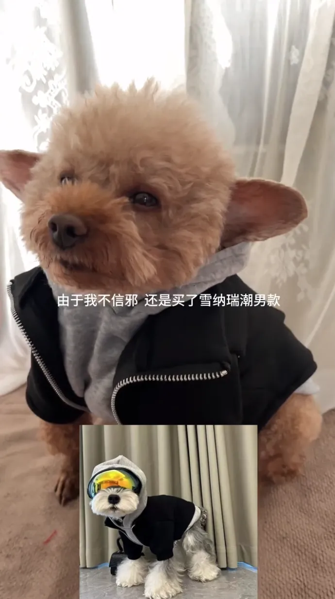 本来还在纳闷为什么,直到看见他家小博美穿上这件雪纳瑞同款衣服,所有的疑惑如奶油般化开...