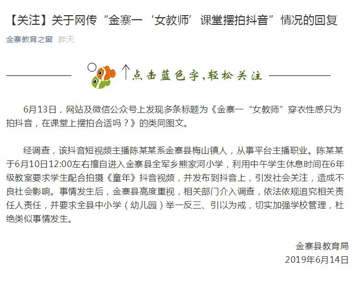 经调查,该抖音短视频主播陈某某系金寨县梅山镇人,从事平台主播职业。陈某某于6月10日12:00左右擅自进入金寨县全军乡熊家河小学,利用中午学生休息时间在6年级教室要求学生配合拍摄《童年》抖音视频,并发布到抖音上,引发社会关注,造成不良社会影响。