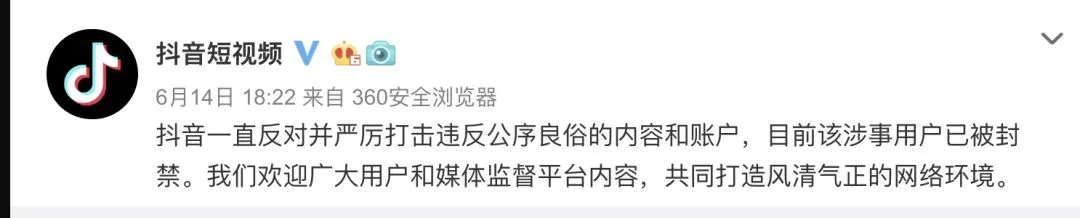 6月14日,抖音官方微博发布消息称,目前该涉事用户已被封禁。