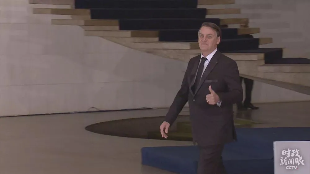 △13日上午,博索纳罗来到巴西外交部一层大厅迎接习主席时,向记者席竖起大拇指。习主席在会谈时对博索纳罗说:我们看好巴西发展前景,对中巴合作充满信心。(央视记者张晓鹏拍摄)