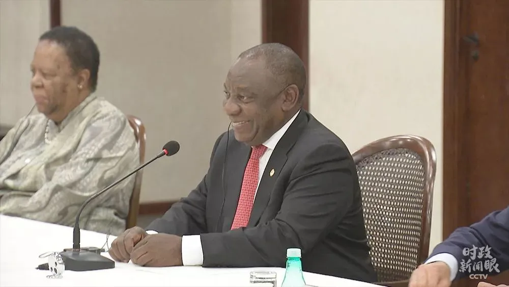 △会谈开始时的拉马福萨。习主席对他说,中南对内面临发展经济的重任,对外都坚定维护多边主义,要巩固“同志加兄弟”的特殊友谊和高度互信。(央视记者马亚阳拍摄)