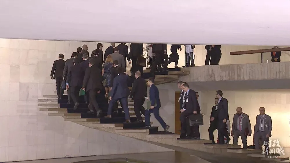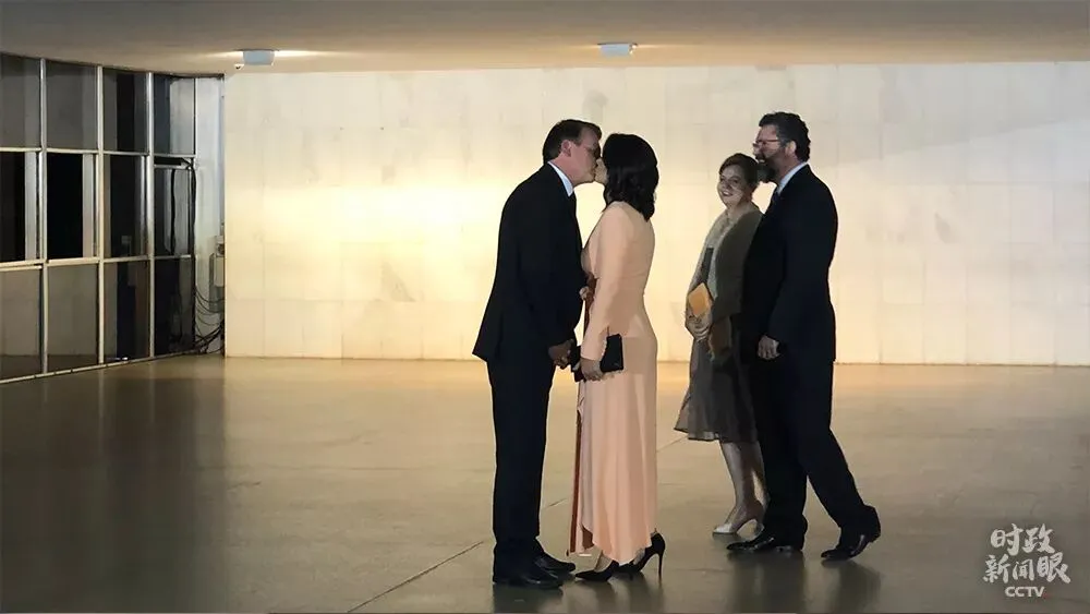 △当地时间13日晚,博索纳罗总统夫妇在外交部一层迎候各国元首夫妇时,上演“巴西式浪漫”。(央视记者马亚阳拍摄)