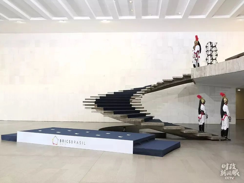 △14日上午,以这个楼梯为背景,五国领导人集体合影。(央视记者薛冠南拍摄)
