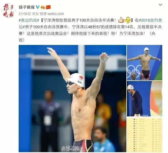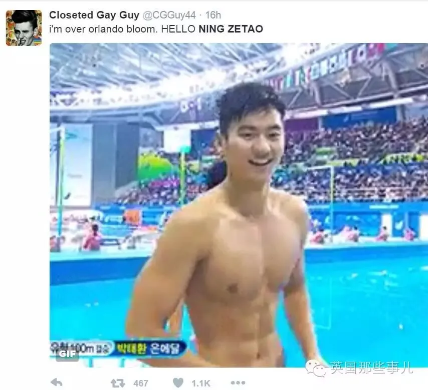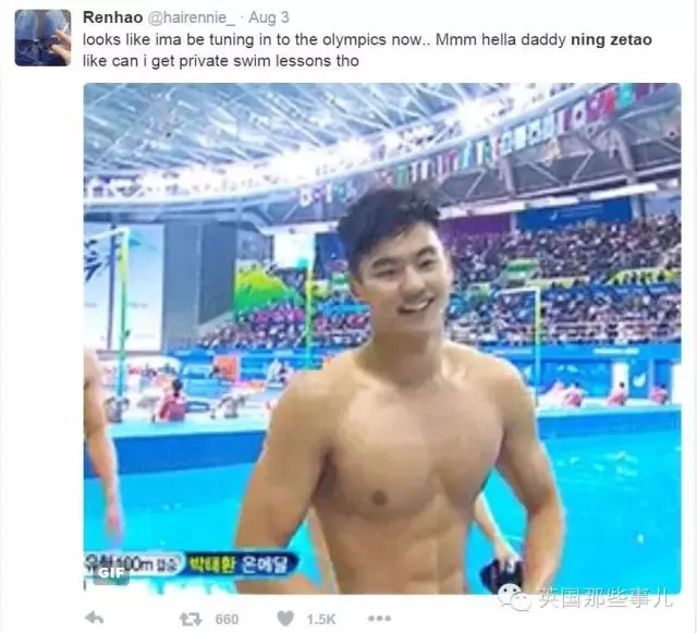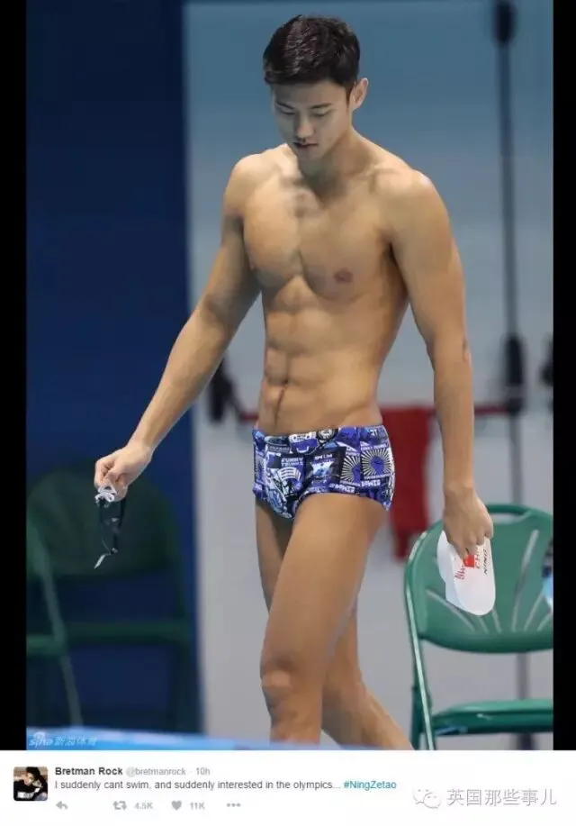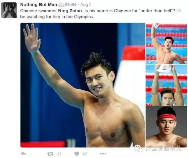 “这是中国游泳运动员宁泽涛。请问他中文名的意思是“性感到爆”吗?我会特地看他的奥运会比赛的”