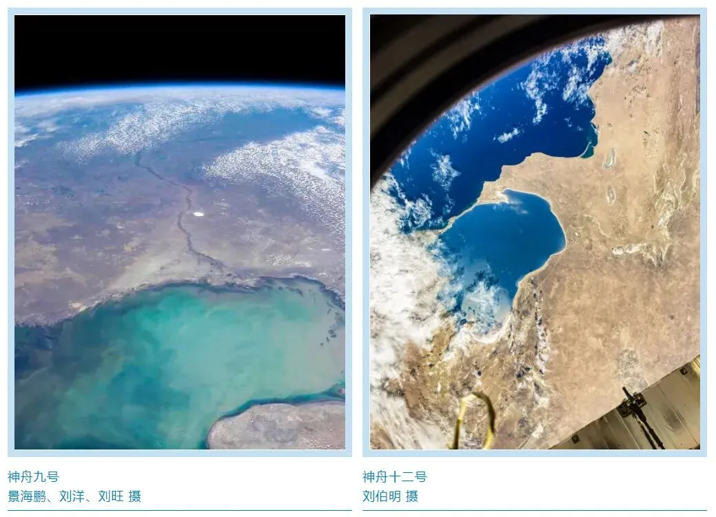 2012年,神舟九号航天员乘组拍下“里海曲线”,一晃9年过去,里海仍然在原地静静地映出碧海蓝天,从景海鹏、刘洋、刘旺到聂海胜、刘伯明、汤洪波,大气层外,中国载人航天一直陪伴着这颗美丽的星球。