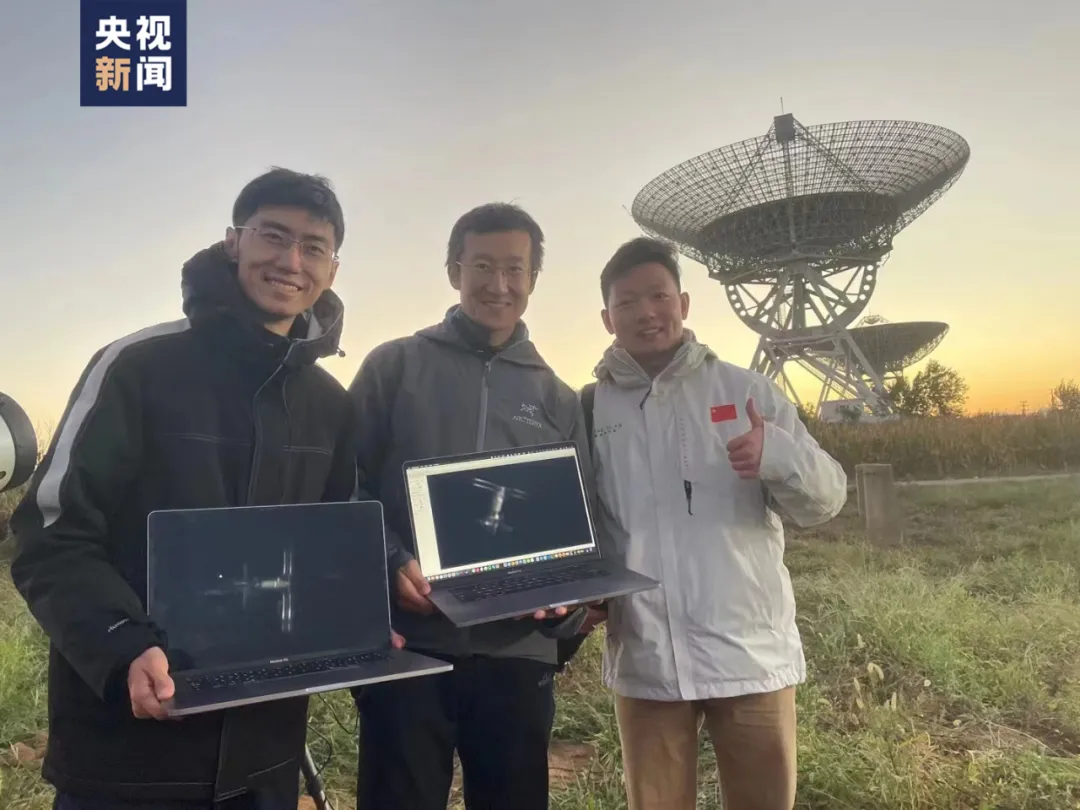 △刘博洋和团队在国家天文台密云观测站旁展示拍到的中国空间站。