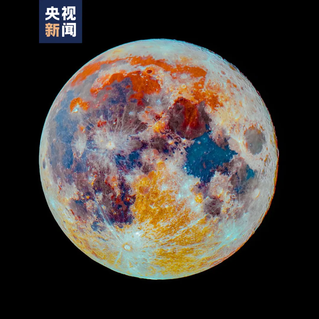 △这是刘博洋的天文摄影作品《彩月》。他将月面图像与月面元素分布相比较,发现红色、蓝色区域与富铁、富钛区域高度匹配。