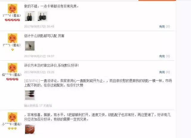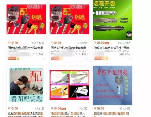 在淘宝网站一家名为某锁具的店铺里就提供看图配钥匙的服务,在商品介绍一栏里清楚的写到,“只要你提供钥匙图片我们就可以给你配出钥匙”的字样,店铺详情显示,该店是主营锁具的五年皇冠老店,其中在图片配钥匙这项服务中已成功交易1645次,累计评价也有500多条。在累计评价中,有不少买家给出了“配得很好,一点卡顿都没有”、“估计什么钥匙都可以配厉害”等的评语。