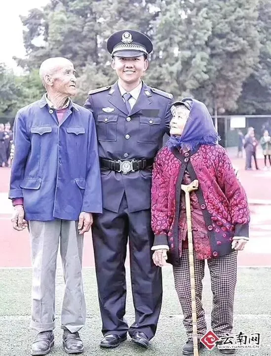 老人关爱的眼神和学警灿烂的笑容