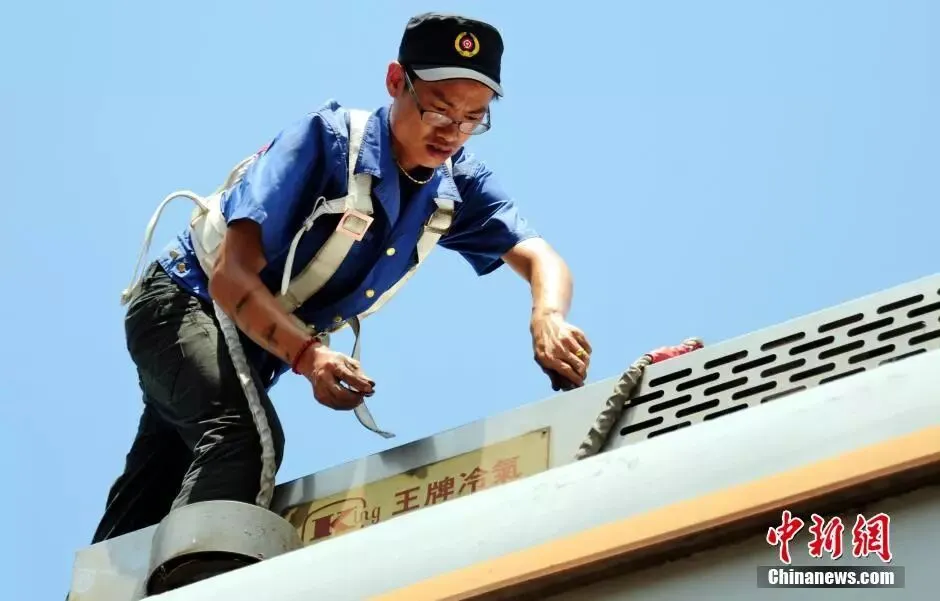 他顶着烈日在客车顶部检修空调