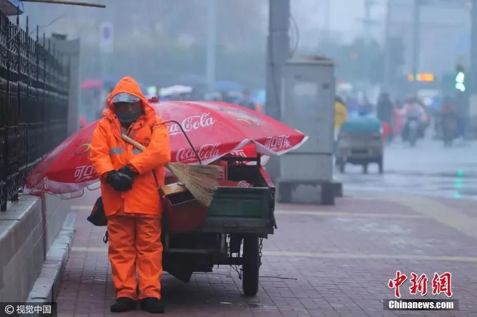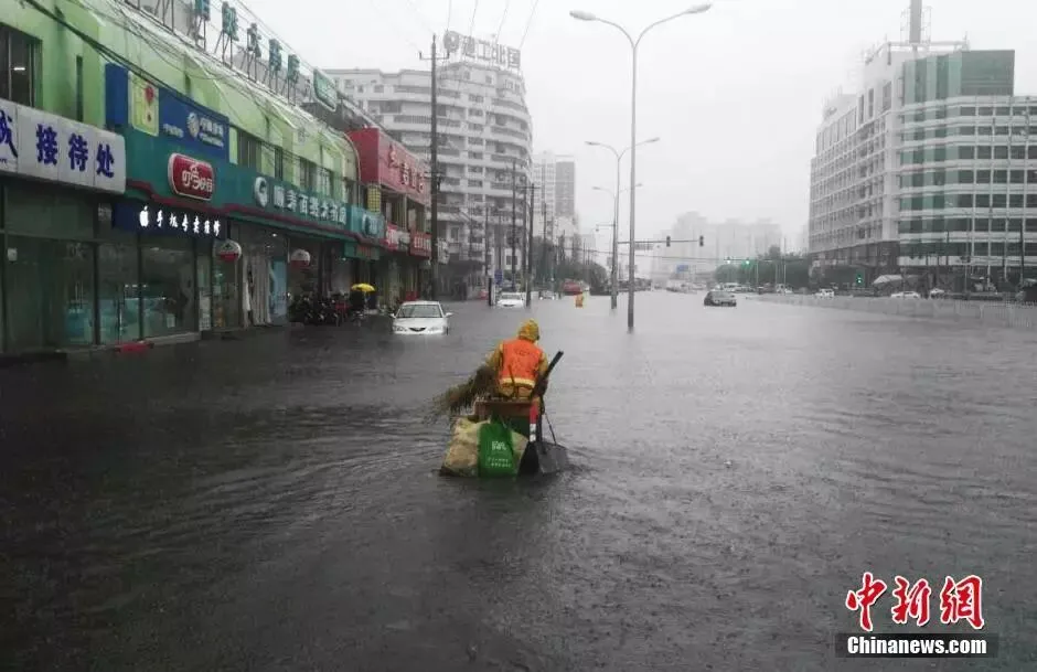 只有他还在冒雨清理垃圾
