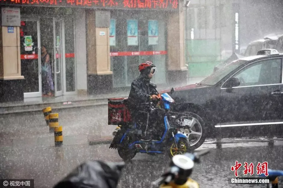 外卖小哥仍坚持冒雨送餐