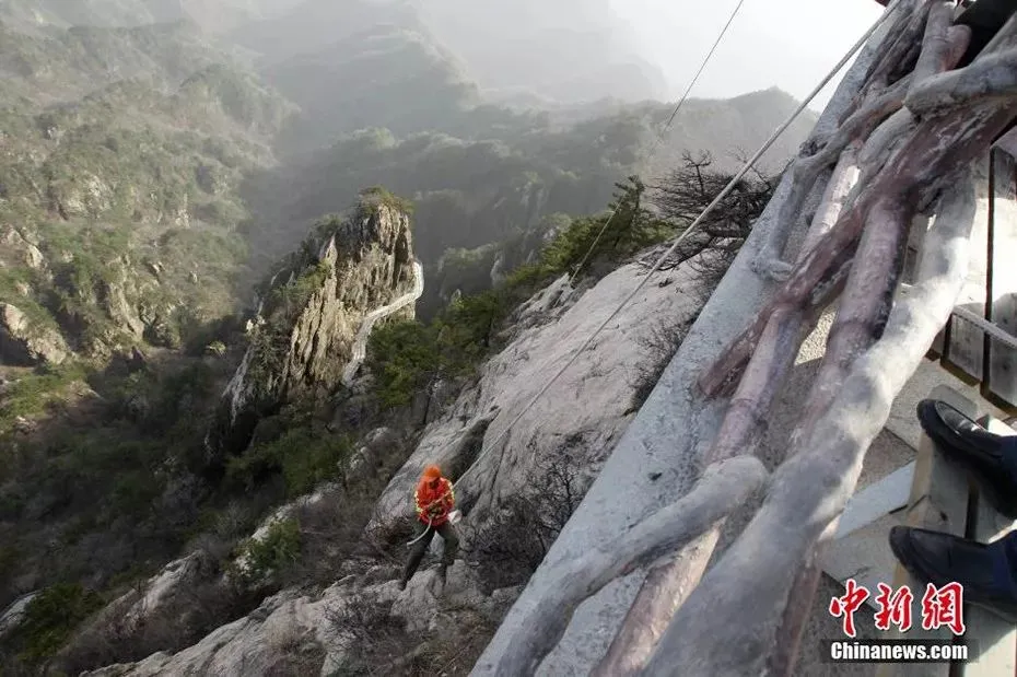 他腰间系着绳子悬在空中捡拾垃圾