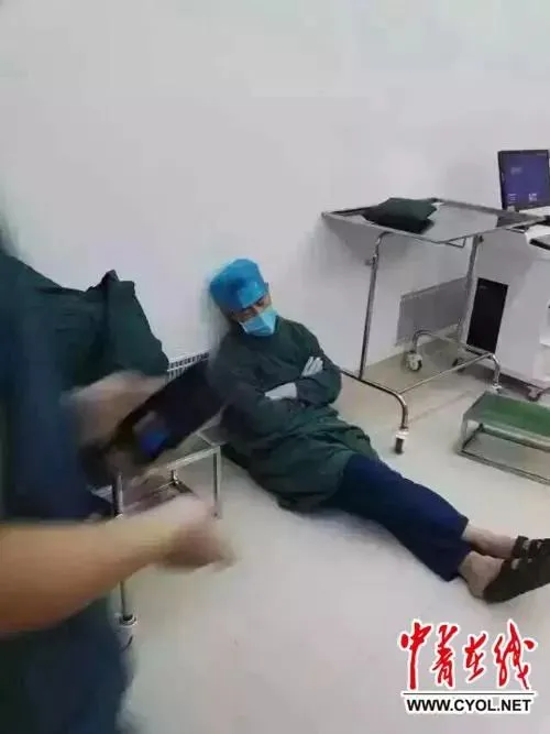 筋疲力尽的他靠在手术台旁睡着了