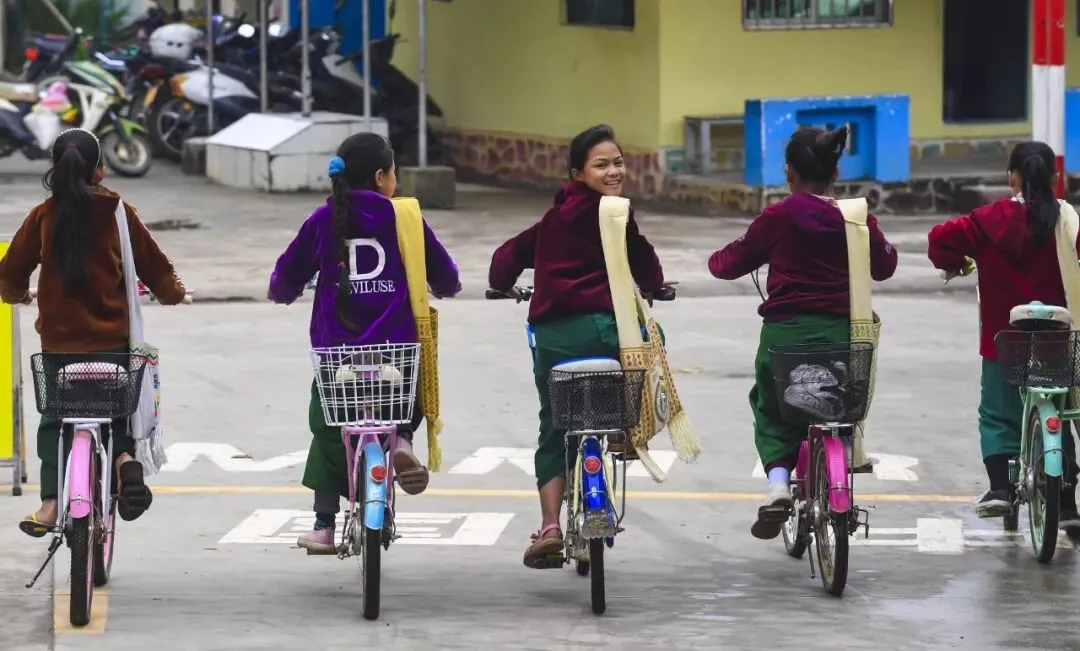 ▲国境线将云南省瑞丽市姐相乡一个村寨一分为二,中方一侧称银井,缅方一侧称芒秀,是典型的“一寨两国”村落。图为银井小学几位缅籍学生骑车回家,跨过银井边防口岸国境线。