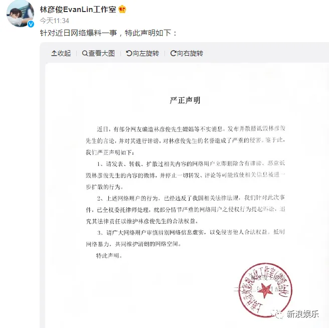 林彦俊方面回应千不二子的爆料,对于女方称其私生活混乱等问题表示内容不实,同时也认定这些说法对林彦俊构成诽谤,将通过法律维护林彦俊的权益。