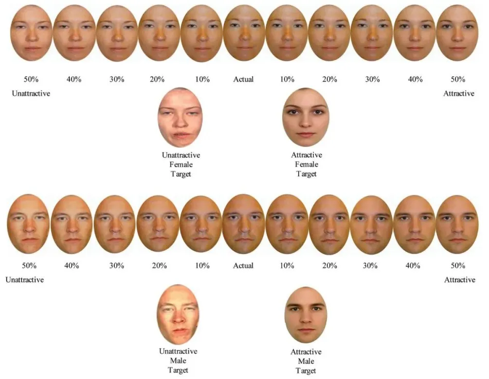 芝加哥大学的 Nicholas Epley,通过人工合成将志愿者的照片变得更有魅力/魅力更低,然后让志愿者挑出认为符合自己真实长相的照片。