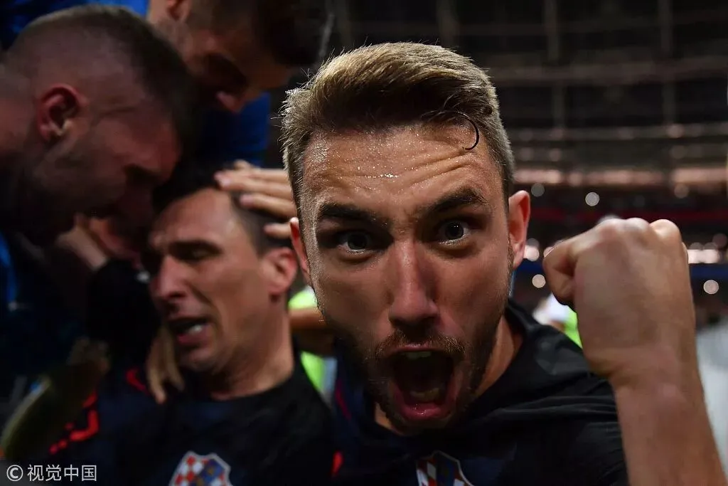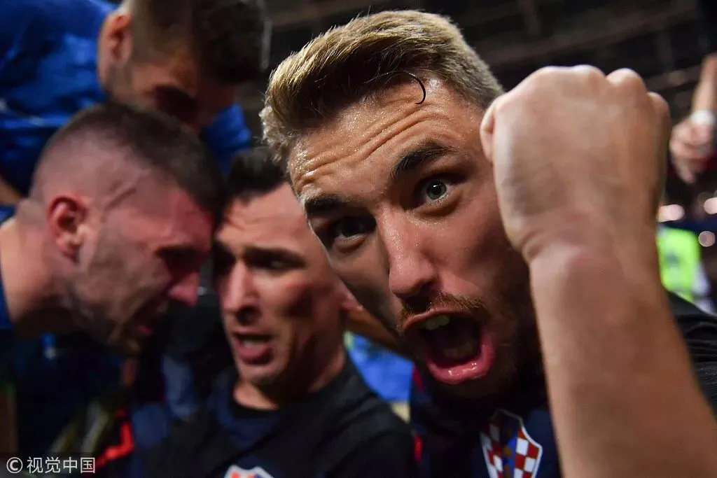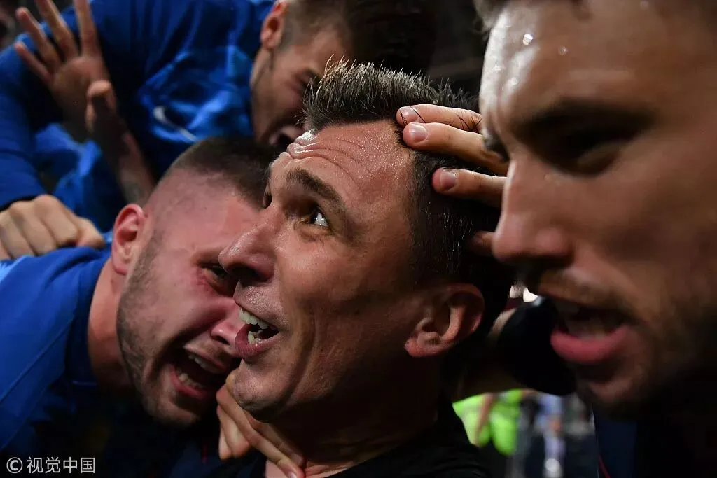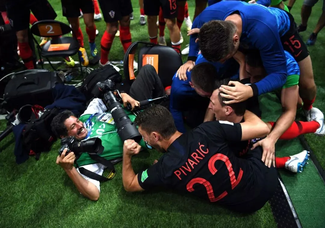 最后这张有点意思:克罗地亚队中锋曼朱基奇成功射入制胜球后与队友们“叠罗汉”庆祝。但这次叠罗汉出了点“小意外”,球员们把场边的法新社记者尤里·科尔特斯撞倒并狠狠地压在了身下。