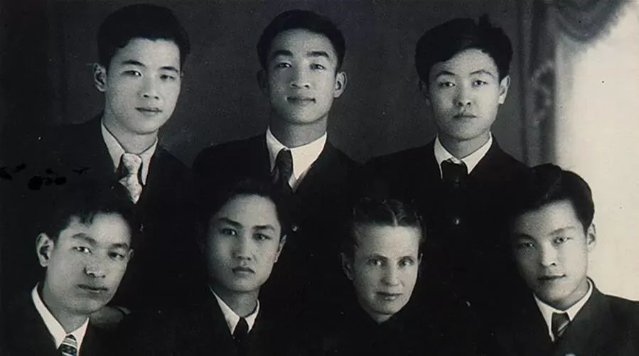 1949年6月1日,李鹏同志(后排左)在苏联伊万诺沃动力学院补习数理化及俄文时与俄语教师费德洛娃(前排左三)及同学合影。 新华社发