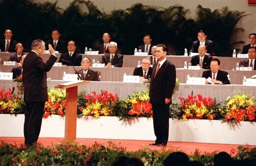 1997年7月1日凌晨,中华人民共和国香港特别行政区成立暨特区政府宣誓就职仪式在香港会议展览中心新翼七楼隆重举行。香港特区首任行政长官董建华宣誓就职,李鹏同志监誓。 新华社记者 刘建国 摄
