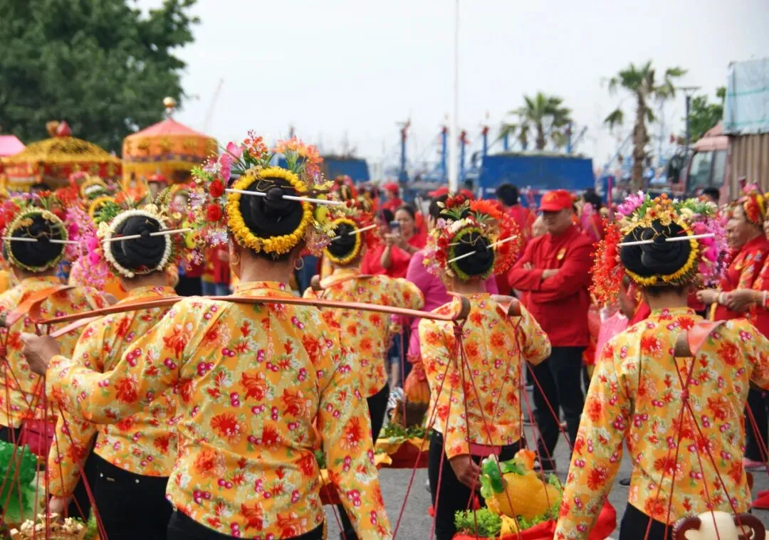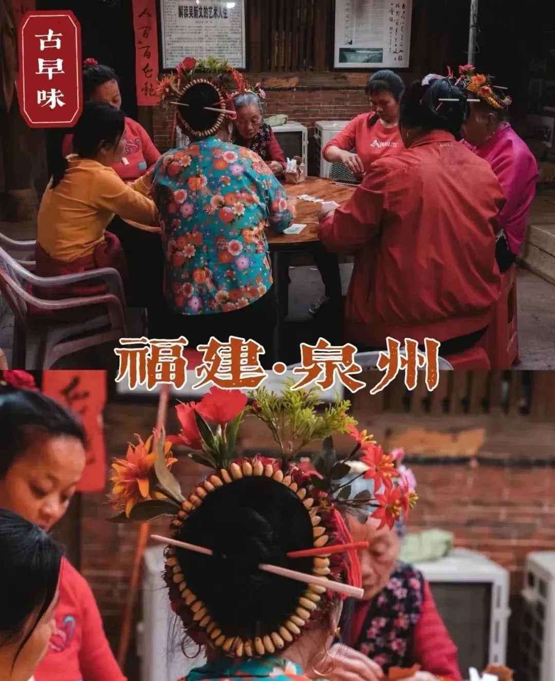 (可自费40元/人体验蟳埔女盘头插花,戴着丁香耳坠,穿着大裾衫、宽脚裤)